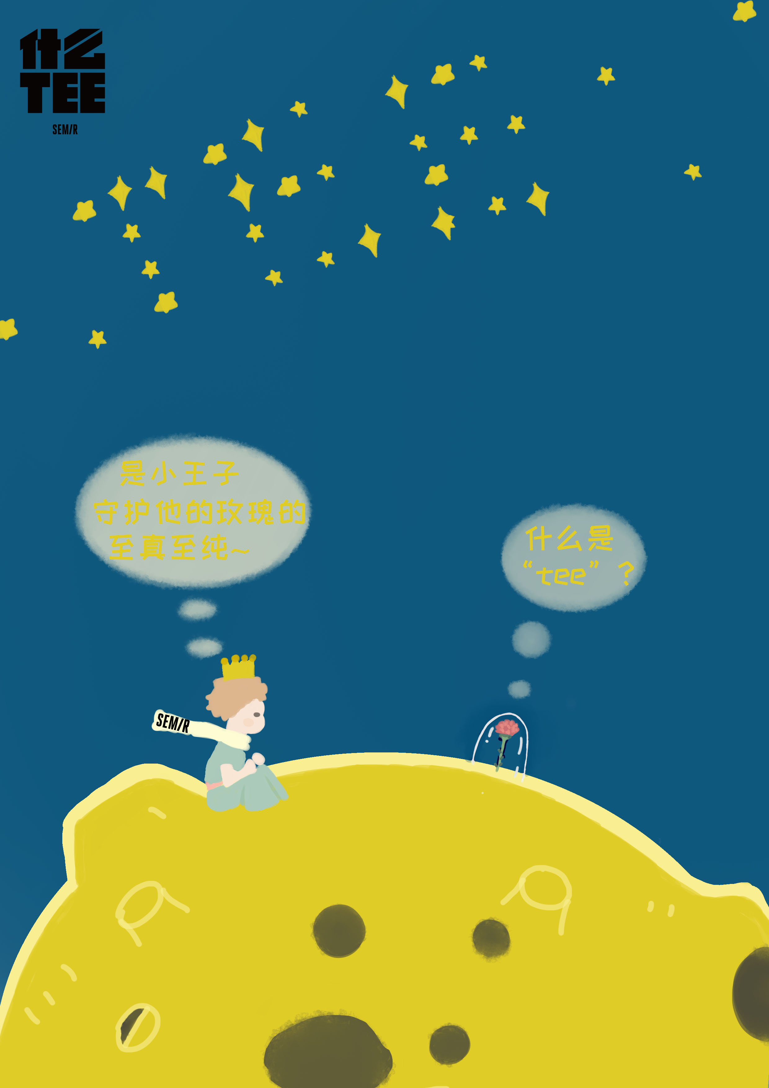 取材于法国作家的著名童话故事小王子。小王子在属于他的星球上遇见了只属于他一个人的玫瑰,从此守护。该作品将这个治愈的故事融入了品牌元素。在小王子的星球上方,是星星排列组成的”tee"玫瑰问小王子那是什么。小王子回答是“守护玫瑰的至真至纯” 一个治愈的故事,总是会触动人们内心最柔软的地方,年轻人表面憧憬未来,或许内心你也会记得小时候读小王子时那个至真至纯的自己。