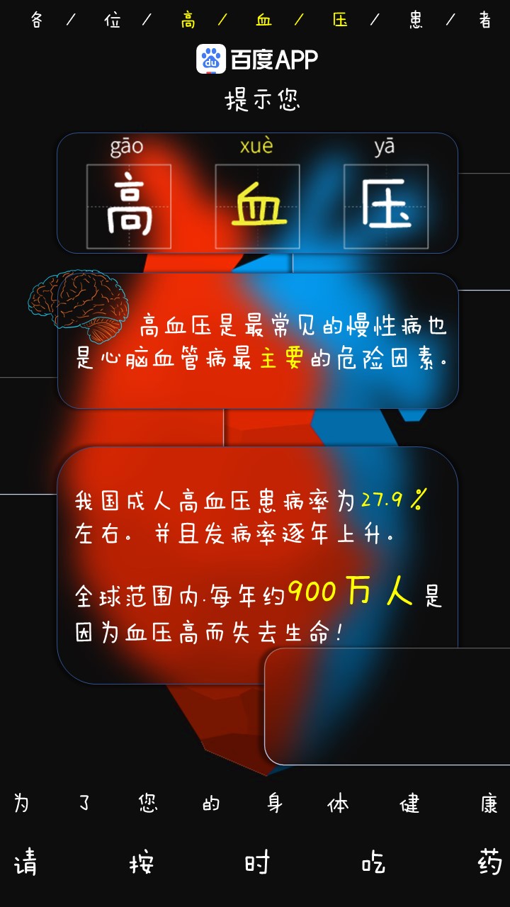 高血压 0 97 0 平面 分享 黑色作为背景,使得红蓝色的心脏变得醒目。因为高血压会影响多个器官,主要选择了脑和心作为元素。运用了这几年比较火的毛玻璃。主要起一个科普,提示作用。 赞一下 hemei 成都市 关注 查看更多信息 ‹ › 发布