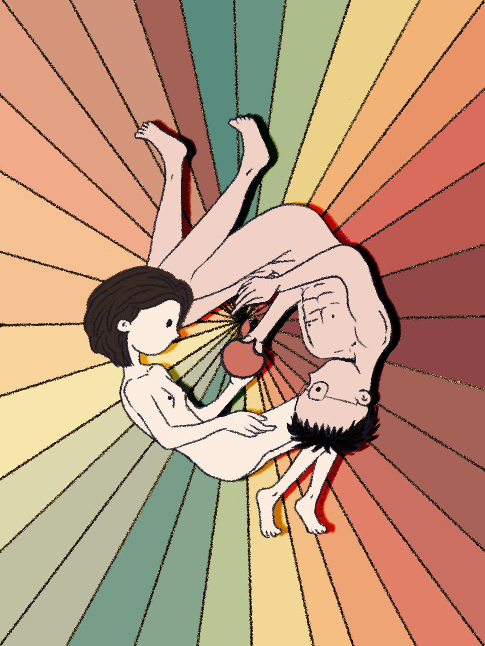 「伊甸园」创作于2021年2月13日,灵感来自于我和老公春节假期的某个生活日常,我们不时会做一些有趣而又行为艺术的小事情,比如上山去砍柴、摘干在树上的樱桃果吃、到海边点一簇篝火、在山中的池塘中裸泳等等。 春节假期,家有暖气,我们光着身子,打开MacBook Pro,站了2个小时,很纯粹的看了一部电影,感觉是常人是不能理解的。这个小事情给到我脑子里的画面,就是在伊甸园中偷吃禁果的亚当和夏娃,只不过此苹果非彼苹果。此苹果是现代科技的象征,裸身的我们则像是原始人。原始和现代在脑中盘旋,落在笔上,就构成了现在的构图,彼此枕在膝头,捧着苹果logo,背景是一道道迸发的射线。而绘制该画的工具恰恰又是ipad和pencil。数字科技无时无刻不在融入我们的生活。这幅画,就是现代的亚当&夏娃和他们的「伊甸园」。
