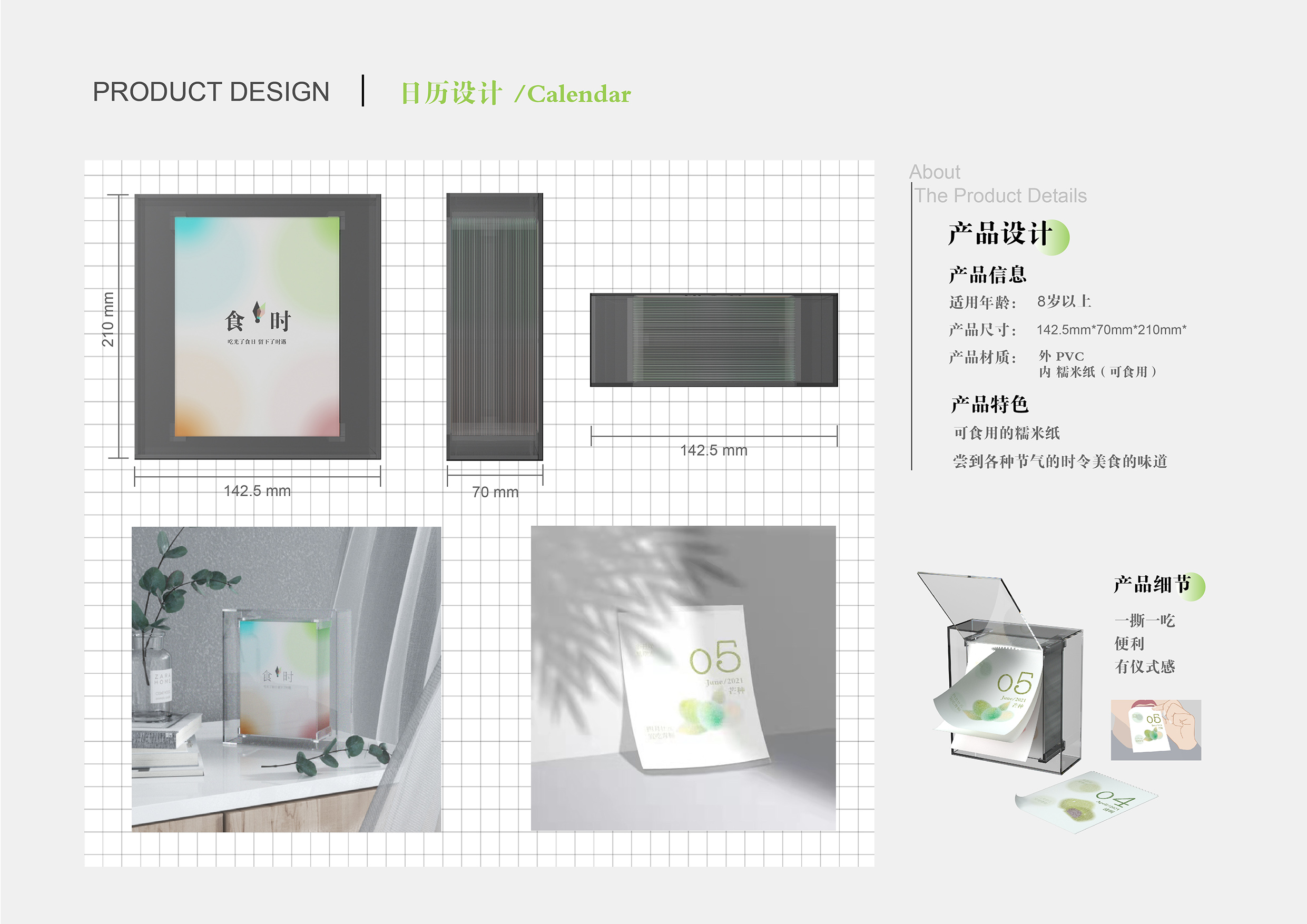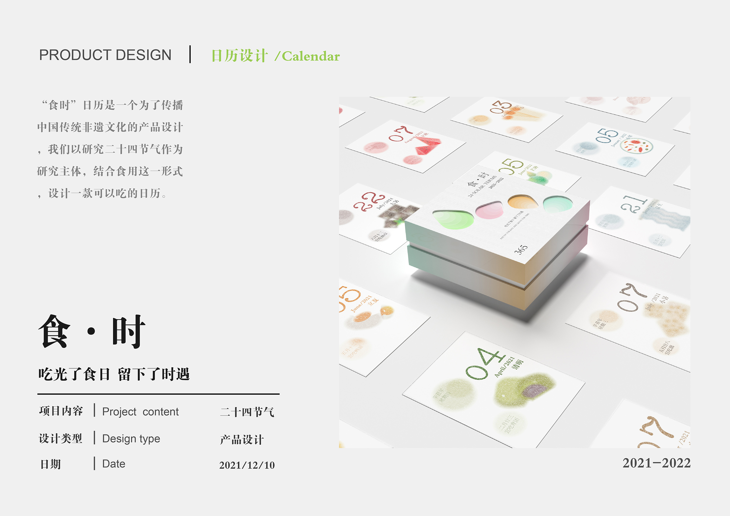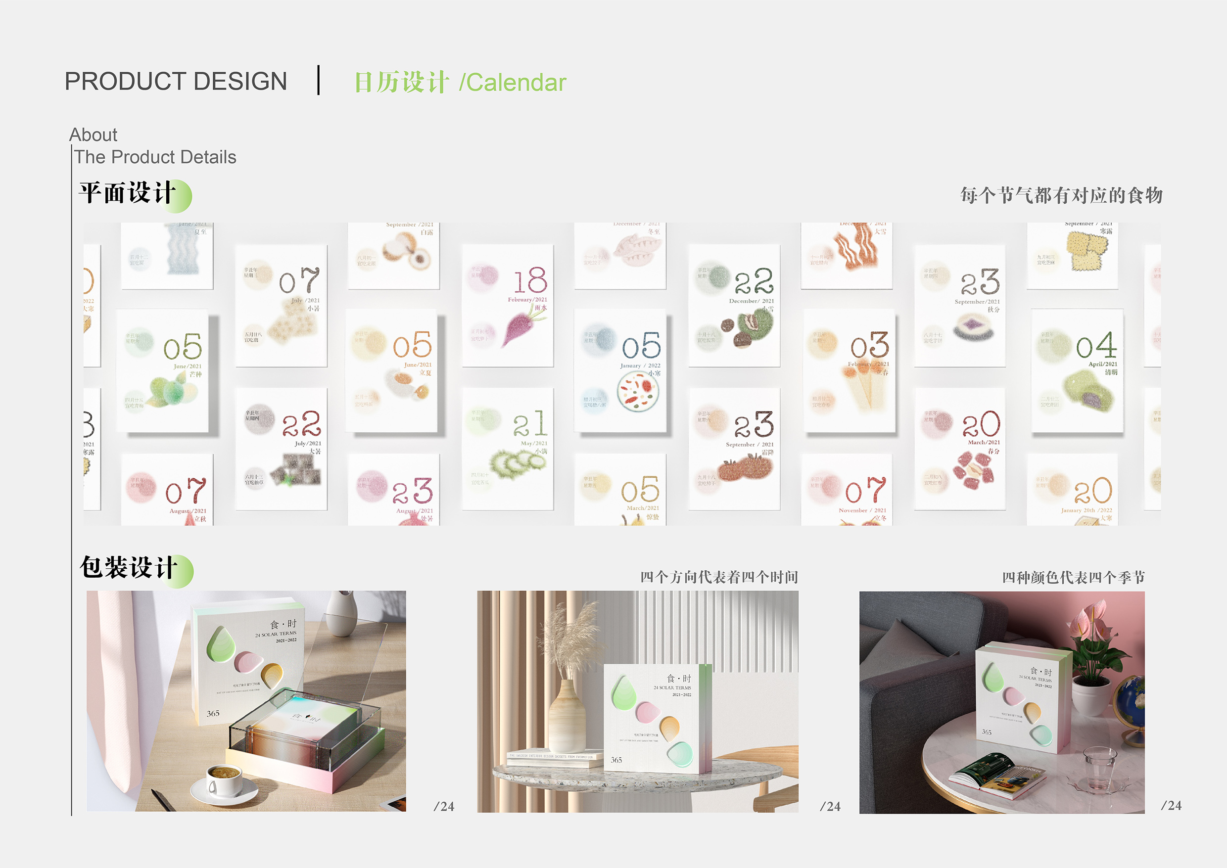 时·食 1 259 0 产品设计、包装设计、插画、二十四节气、非遗、传统文化、国潮 分享 两种感觉: 味觉——酸·甜·苦·辣 视觉——红·橙·黄·绿·青·蓝·紫 日历的包装采用亚克力材质,透明的材质便于观看时间,密封的设计可以有效的隔绝空中的灰尘,保证内部糯米纸日历的干净可食用。日历整体呈现出干净简洁的观感,亚克力材质在阳光的照射下会反射出独特的光晕,融洽地融入所处的空间中。 以春·夏·秋·冬四个节点,呈现出具有代表性的二十四个时令食物。每个季节都有代表的主要颜色,春—“绿”为万物复苏,夏—“红”为骄阳似火,秋—“橙”为秋高气爽,冬—“蓝”为冰天雪地。 赞一下 四大魔法小仙女 ‹ › 发布