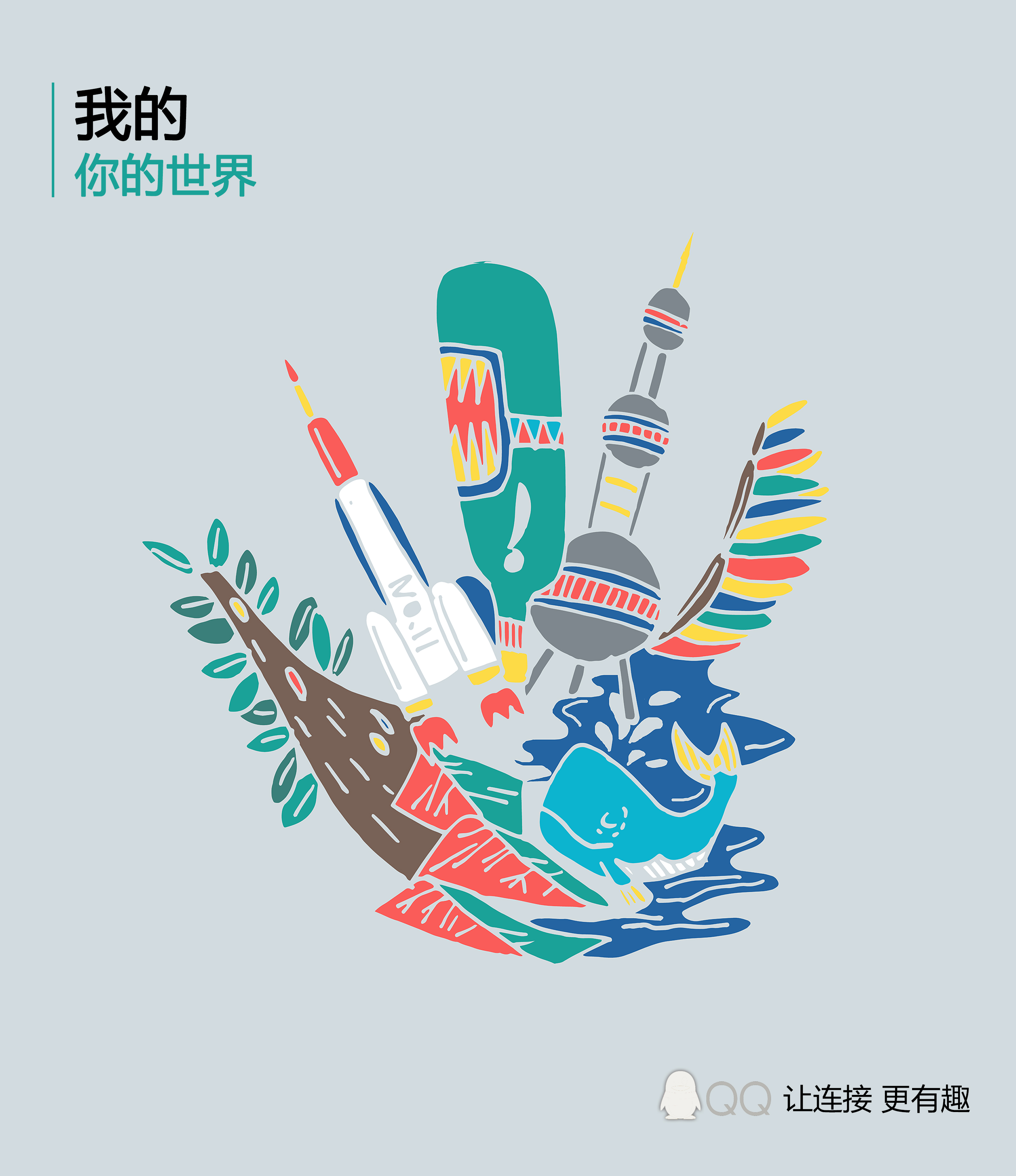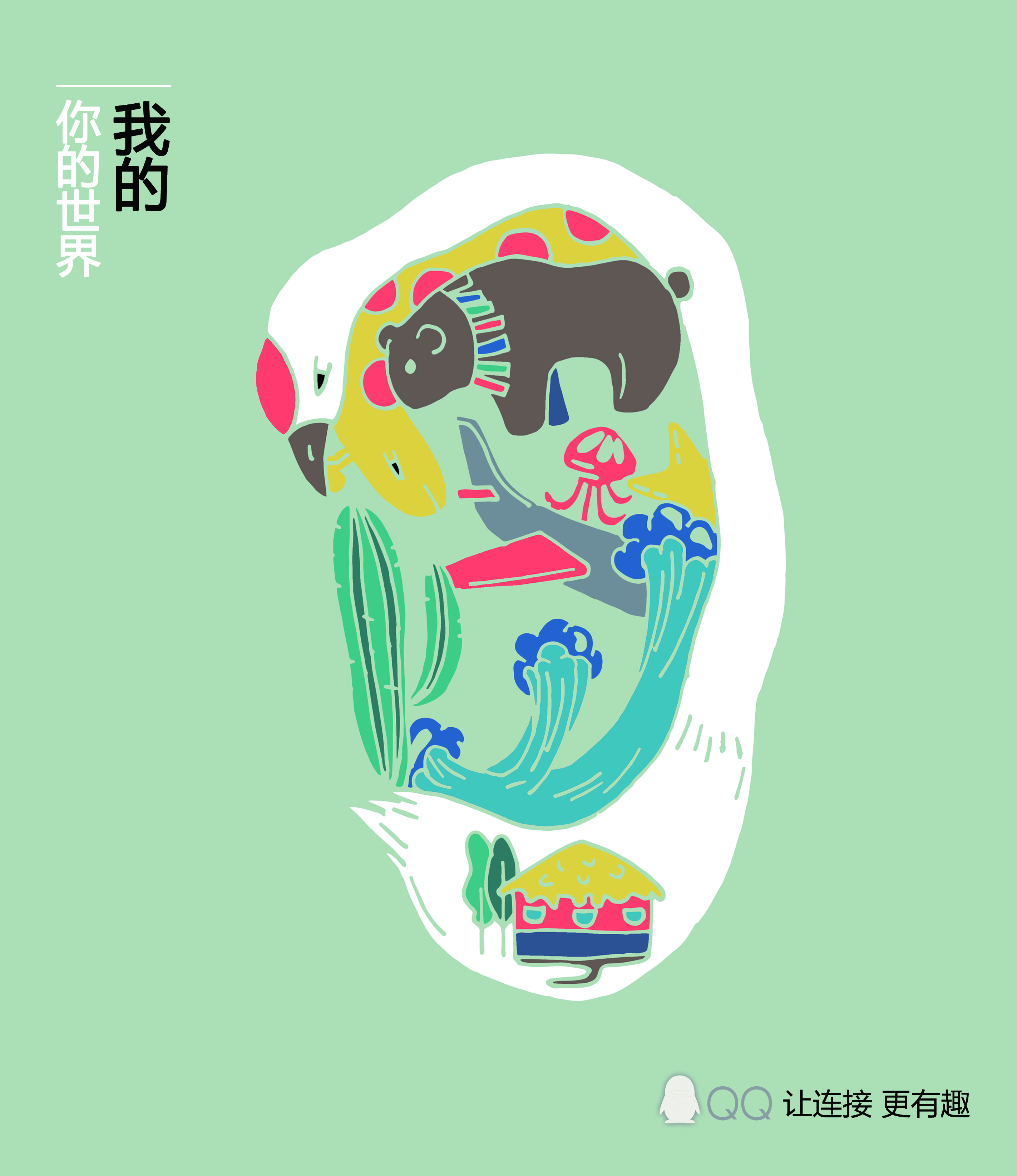 我的,你的世界|QQ,让连接更有趣 373 3229 0 平面设计 分享 我的,你的世界——眼。 我们在QQ中,与好友们的联系很微妙。我们可以通过好友生活里的分享,知道许多信息,看到许多我们没有见过的地方或事物。平面里描述的就是这种新鲜的连接,我们再加上好友,就能构成一个世界。 我的,你的世界——耳。 听到的任何有趣的声音,都是通过QQ里,好友的分享。声音是与世界、人际连接的媒介之一。这张平面,表达的也是与上一张一样的意思。 我的,你的世界——手。 这张平面表达的是,世界就掌握在自己手中的感觉。手里只要有着腾讯QQ,似乎自己就与这个世界紧紧的连接在一起。 赞一下 重感冒 ‹ › 发布