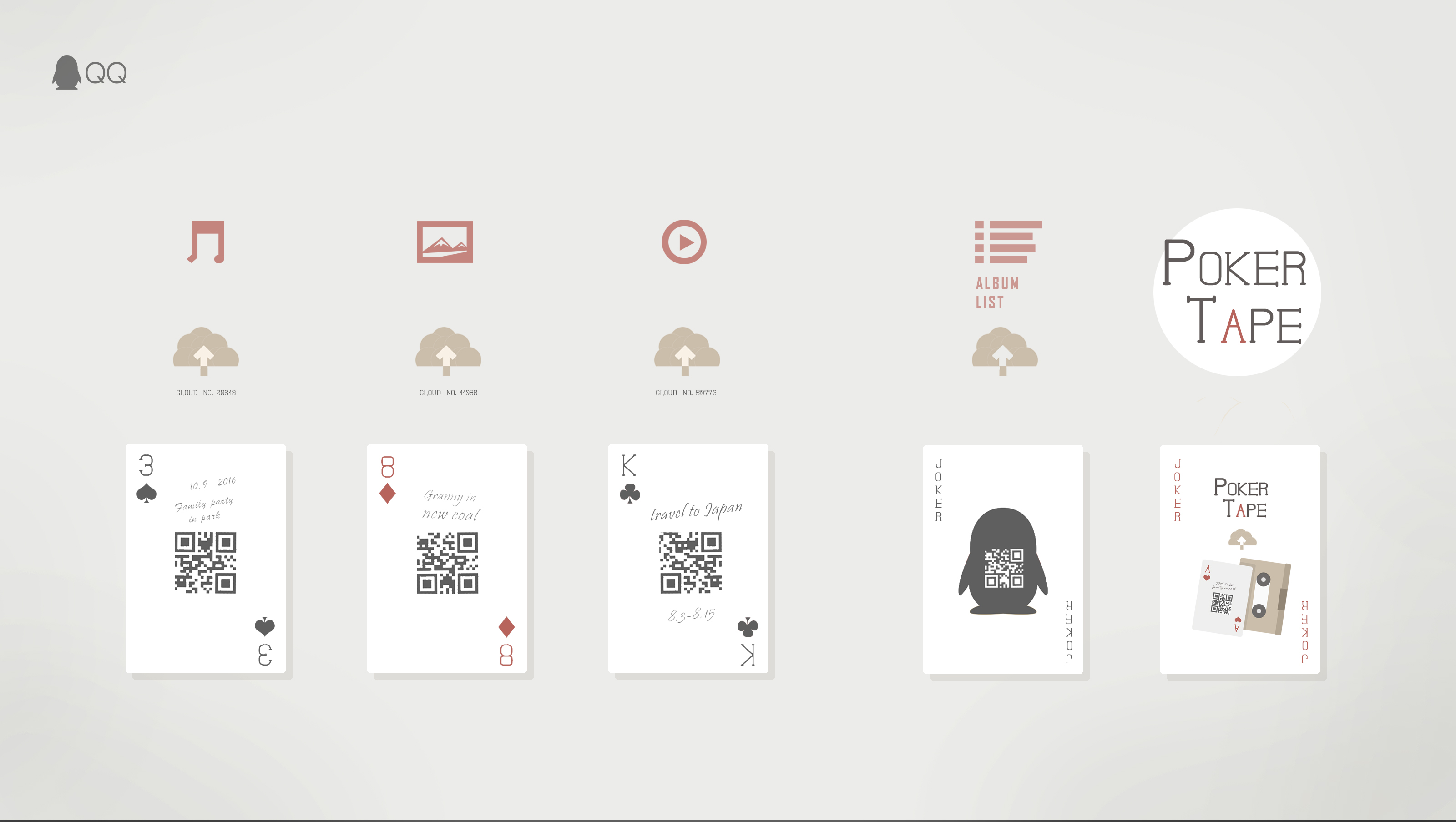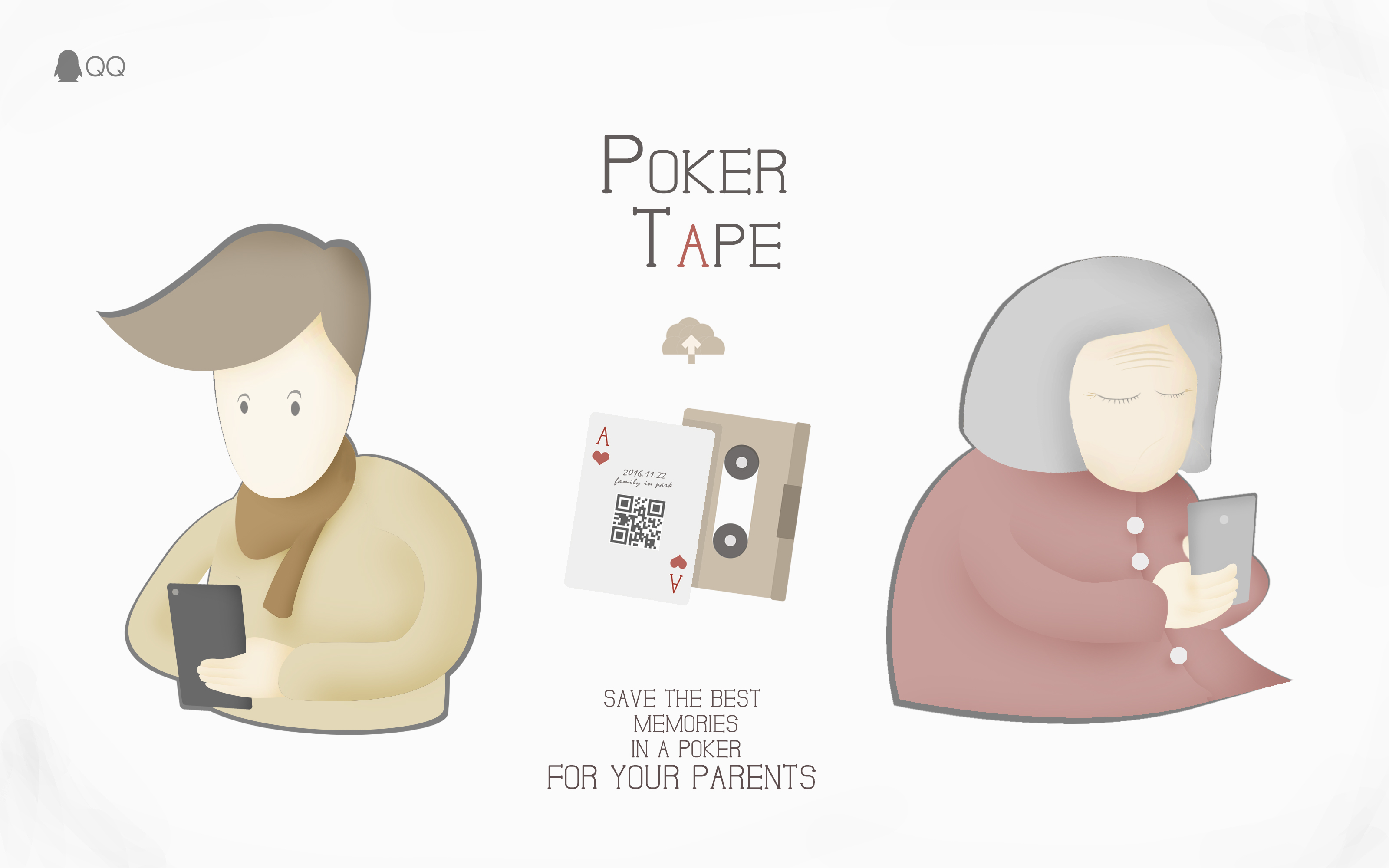 KEY WORDS:【-1-关注中老年人的“媒介技术鸿沟”问题】【-2-能存储影像的扑克录影带】【-3-云存储与实体的结合的创意产品】————————————————————————————————————————————————————————————【社会问题:不会用云存储的中老年人】“QQ,让连接变得更有趣”,可是有一部分人却错过了这种应该享受到的乐趣,他们就是社会中缺乏媒介使用基础能力的中老年群体。在没有子女贴身指导的情况下,家庭里的中老年成员在使用新型媒介技术的时候往往存在诸多困难。其中包括QQ空间和微信好友圈这类可以将个人的珍贵影像资料保存到云空间的个人数据存储模式,对于相当一部分缺乏媒介基础的中老年人来说都是难以享受到的福利。对于保存回忆,他们更偏向所熟知的传统方式,如老相册(照片库)、录像带(影像库)、磁带(音频库)、日记(文字库)…… ————————————————————————————————————————————————————————————【作品理念:用创意性活动唤醒社会对中老年人“媒介技术鸿沟”问题的关注】+【产品表现:符合中老年人的操作模式,无需繁琐账号与登录,只需扫码扑克牌就能使用的简单云存储服务】 扑克录影带是一款“云存储扑克”,是将云存储与实体相结合的创意产品。纸质的扑克牌作为传统物件更容易被中老年人接受,同时这副扑克每张牌正面都有一个链接到专属QQ云空间的独特二维码。用户通过手机QQ软件扫描该二维码后,可以将手机中值得珍藏的影像、图片或语音存储到该扑克牌所对应的云空间单位里。于此同时,还可以在纸质扑克牌上用笔手写上该张牌上存储的内容,如“11月22日,公园野餐”,这种标签记录方式更符合中老年人的使用习惯。家中的中老年人即便不会存储,只需要扫描一下扑克牌上的二维码,就能观赏到子女为他们存储到牌中(云端)的影像或图片。一副QQ空间“云存储扑克”,相当于包含了52本录影带或磁带(扫描两张王牌二维码则是获得整副牌的存储目录),能够永久贮存回忆中最为珍贵的影像资料。扑克录影带能够帮助中老年人在子女不在家无法指导的时刻,用最简单的方式,随时随地重温记忆中的珍贵镜头,避免了帐号登录,信息查找,影像加载等复杂过程。久而久之,老人们可以根据牌的花色与大小来记住事件的存储序列,比如“孙女3岁生日的视频存在红心3里”,如果忘记牌号,牌面上也没有手写记录,还可以扫码“大小王牌”来观看这副牌中的影集目录,从而定位出准确的牌。用扑克牌来云存储资料对中老年人来说具有永久性与便利性,不仅无需账号,在手机或者QQ账号更换以后,仍可以随时扫码扑克提取牌中的内容。 ————————————————————————————————————————————————————————————【作品意义:呼吁社会关注并改善中老年人“媒介技术鸿沟”问题】中老年人生长于上个时代,往往有着自己的行为习惯。他们对于新事物的抵触与对旧事物的依赖,并非完全因为其思想的守旧,更多是缺乏年轻人群对他们的耐心指导与帮助。我们常常在社会中看见因为不会使用新的媒介技术导致两代人之间社会交往出现裂痕的现象,这种令人痛心的现象背后,有着更多老一辈人的无奈。因此,我们希望该社会化营销作品能够唤醒全社会对于中老年人“媒介技术鸿沟”问题的关注,呼吁年轻人多理解自己的父母长辈,多用适合他们的方式语气,耐心地引导他们学习新的媒介技术,让中老年人群克服“技术鸿沟”,真正享受到与世界的连接所带来的乐趣。