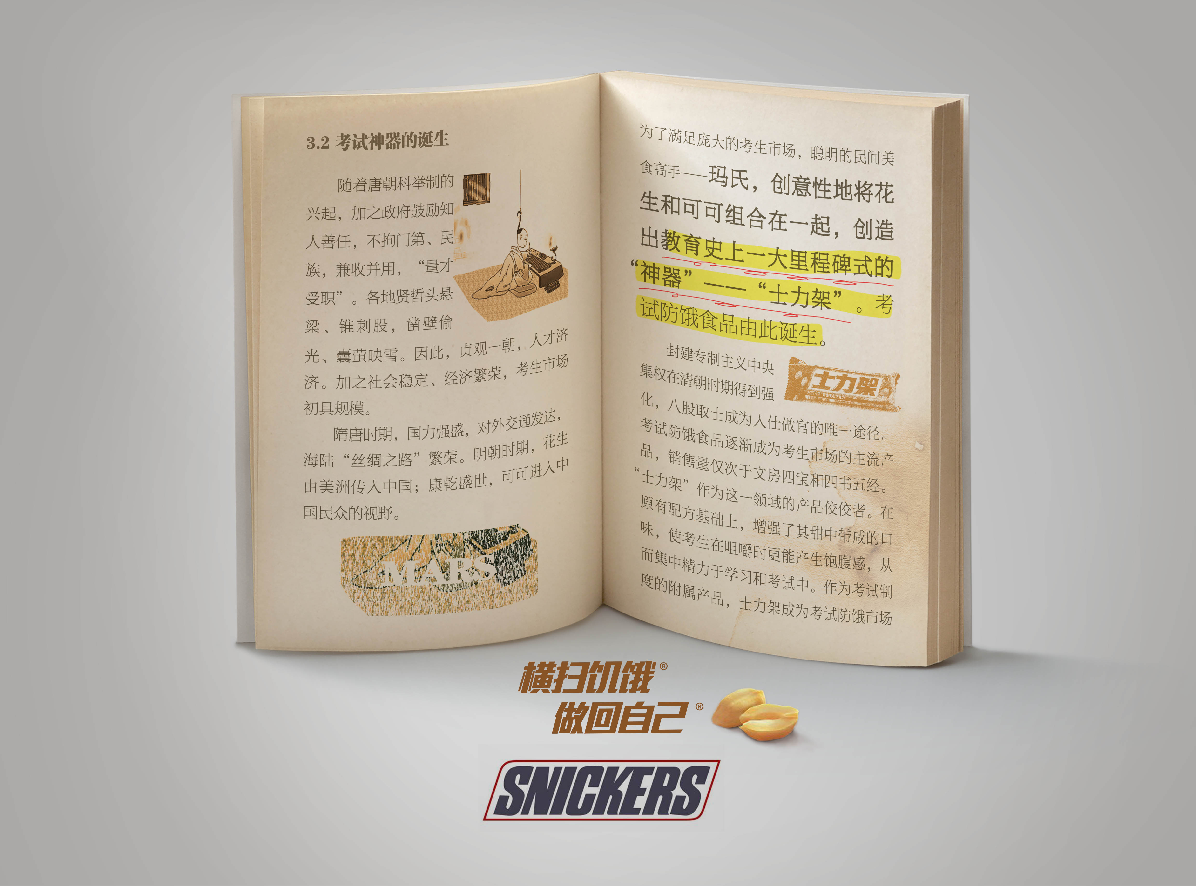 大脑处于高集中紧张状态时,会大量消耗能量,特别是在考试情境中,常会有饥饿的感觉。我们就利用这一人体生物反应,来探索考试诞生之时考试防饿神器诞生发展的历史。作为科举考试延伸出来的附属食品,采取历史著书立说的方式,打造士力架成为教育史上一个伟大的发明,以此来表现士力架考不饿的产品主张。 When the brain is in a high concentration of tension, it will consume a lot of energy, especially in the situation of exams wherethere is often a feeling of hunger. We will use this biological human response to explore the developmental history of this hunger-proof food since the emergence of exam. As a kind of subsidiary food derived from Imperial Examination, Snickers will be presented in written books and established theories as a great invention in the history of education so as to perform Snickers’ concept of “No hunger during exams.”