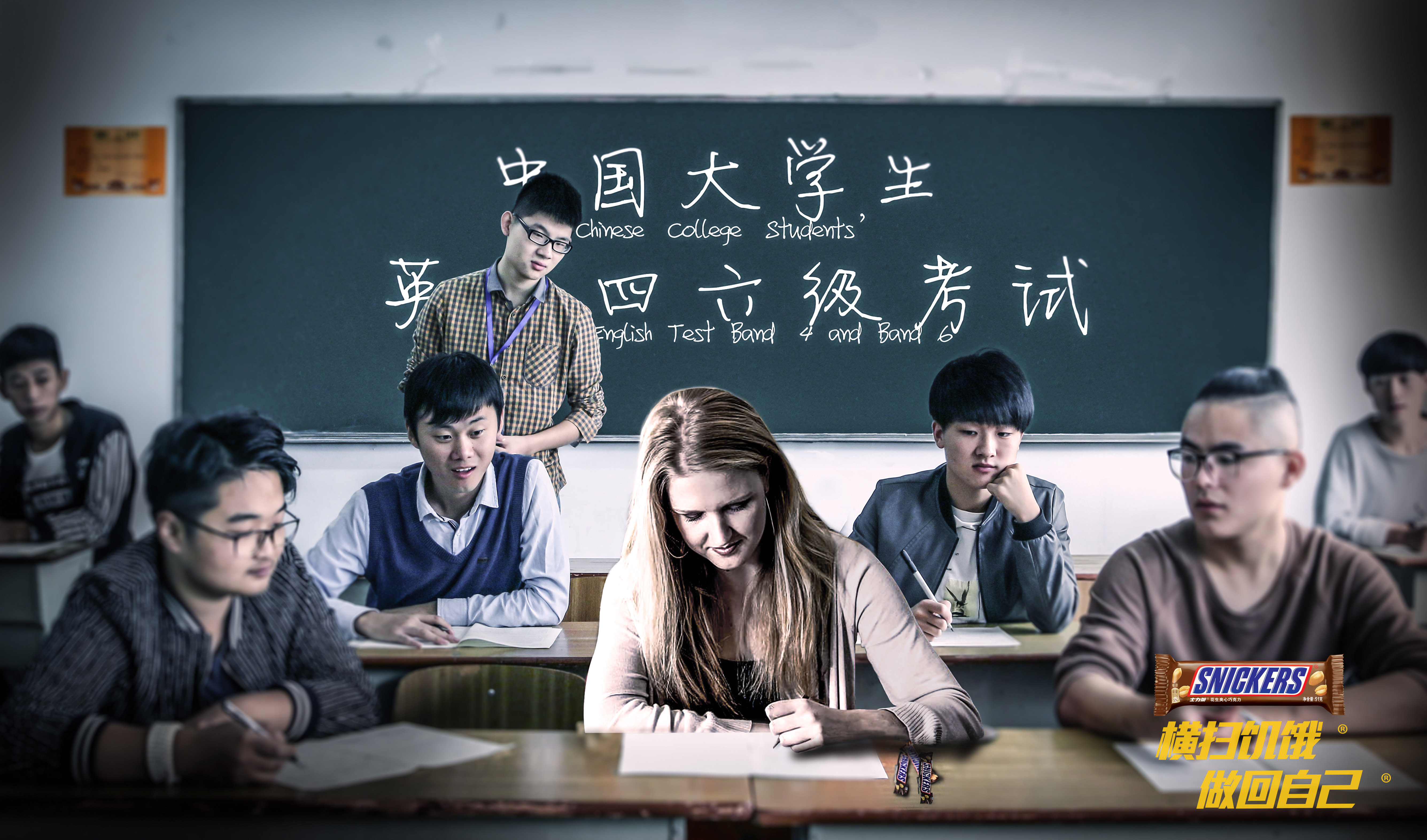 四六级考试是每个中国学生在大学中必须参加的考试,大部分学生都对它很恐惧,在四六级英语中国考场里,一位吃了士力架的女同学变成外国人,考试有如神助。身边其他没有吃士力架的同学和监考老师惊讶的看着她。 Posters from "energy", the members force plane as spiritual sustenance of exam, in the national English test band 4 and band 6, a Chinese student for ate snickers in the examination, become a foreign student, become the focus of the examination room, vivid interpretation 。