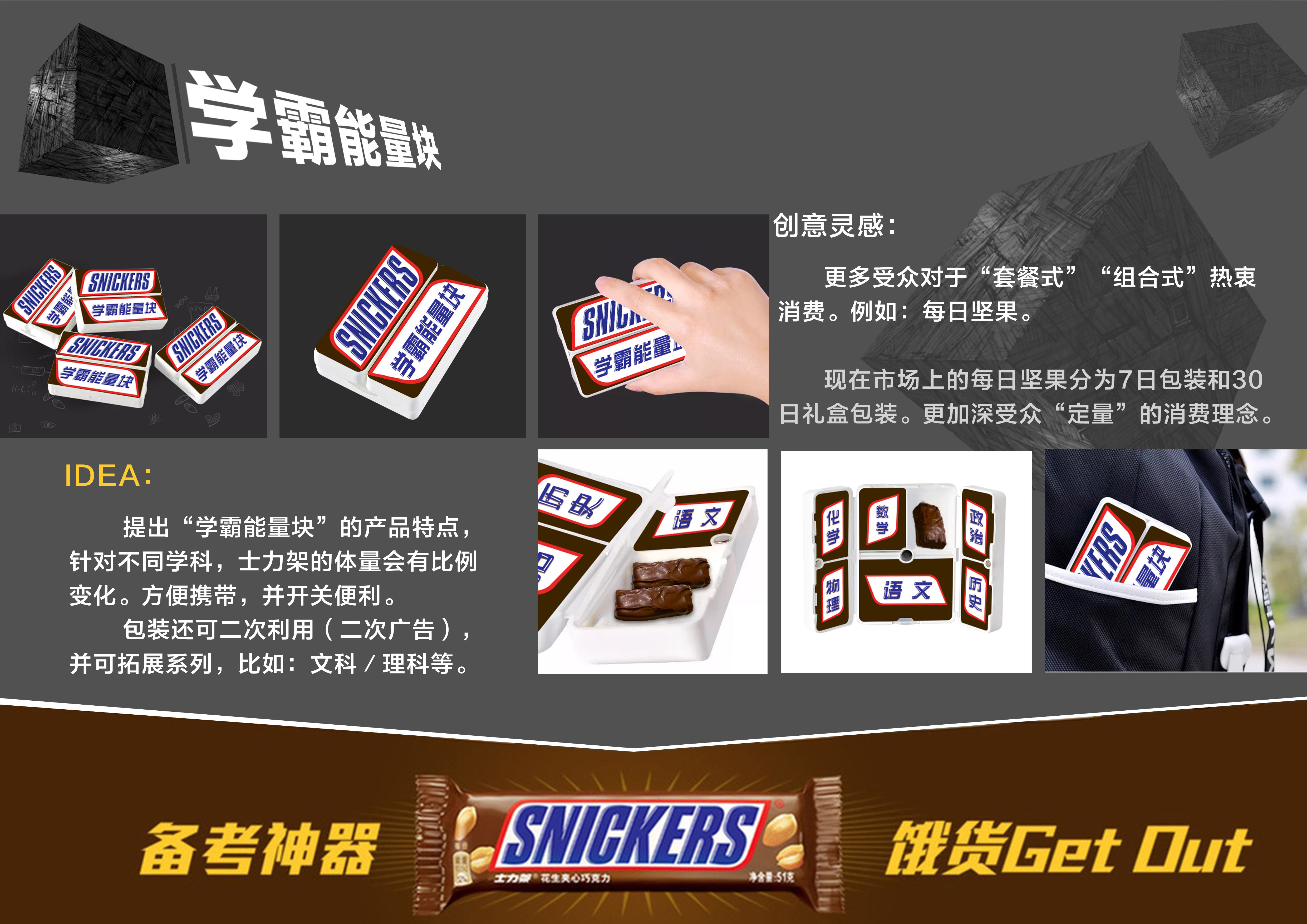 学霸能量块 1157 2534 0 分享 提出“学霸能量块”的产品特点,针对不同学科,士力架的体量会有比例变化。方便携带,并开关便利。 包装还可二次利用(二次广告),并可拓展系列,比如:文科/理科等。 赞一下 Energon能量块 ‹ › 发布