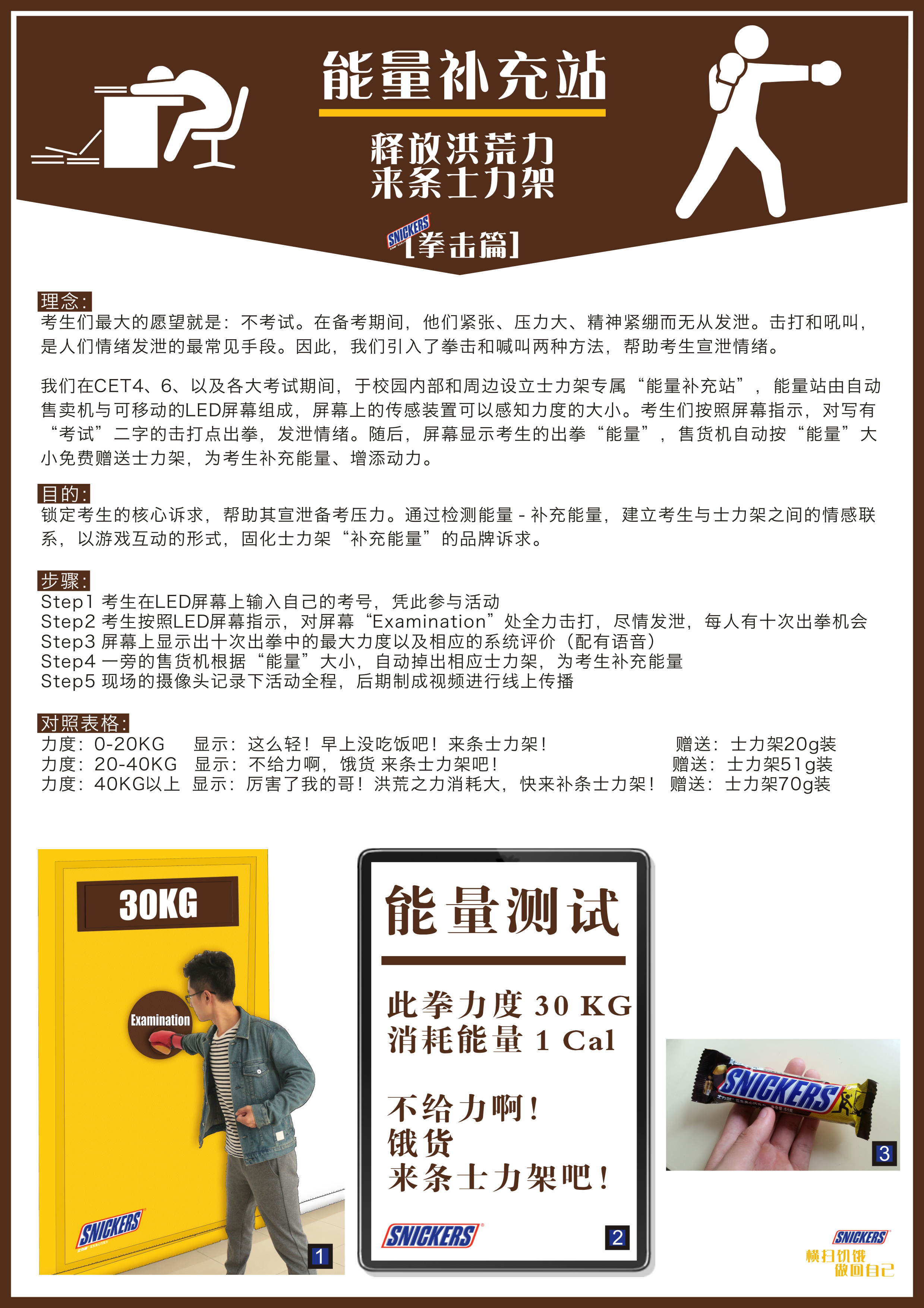Step1 考生在LED屏幕上输入自己的考号,凭此参与活动 Step2 考生按照LED屏幕指示,对屏幕“Examination”处全力击打,尽情发泄,每人有十次出拳机会 Step3 屏幕上显示出十次出拳中的最大力度以及相应的系统评价(配有语音) Step4 一旁的售货机根据“能量”大小,自动掉出相应士力架,为考生补充能量 Step5 现场的摄像头记录下活动全程,后期制成视频进行线上传播 力度:0-20KG 显示:这么轻!早上没吃饭吧!来条士力架! 赠送:士力架20g装 力度:20-40KG 显示:不给力啊,饿货 来条士力架吧! 赠送:士力架51g装 力度:40KG以上 显示:厉害了我的哥!洪荒之力消耗大,快来补条士力架! 赠送:士力架70g装