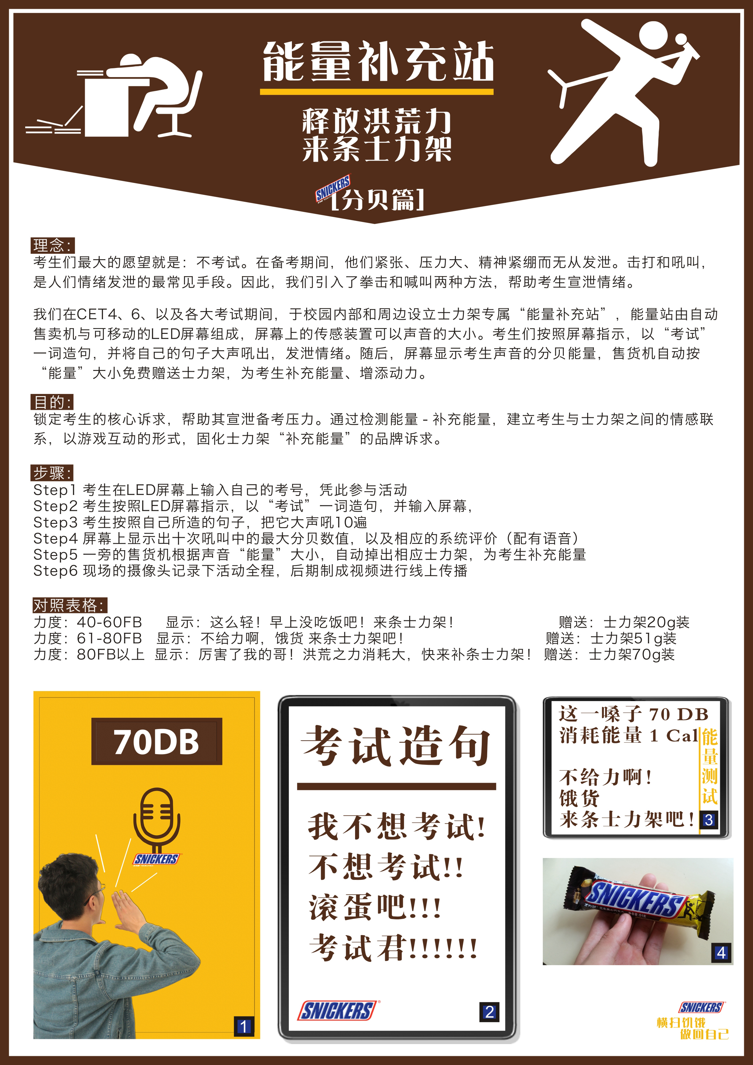 Step1 考生在LED屏幕上输入自己的考号,凭此参与活动 Step2 考生按照LED屏幕指示,以“考试”一词造句,并输入屏幕, Step3 考生按照自己所造的句子,把它大声吼10遍 Step4 屏幕上显示出十次吼叫中的最大分贝数值,以及相应的系统评价(配有语音) Step5 一旁的售货机根据声音“能量”大小,自动掉出相应士力架,为考生补充能量 Step6 现场的摄像头记录下活动全程,后期制成视频进行线上传播 力度:0-20KG 显示:这么轻!早上没吃饭吧!来条士力架! 赠送:士力架20g装 力度:20-40KG 显示:不给力啊,饿货 来条士力架吧! 赠送:士力架51g装 力度:40KG以上 显示:厉害了我的哥!洪荒之力消耗大,快来补条士力架! 赠送:士力架70g装