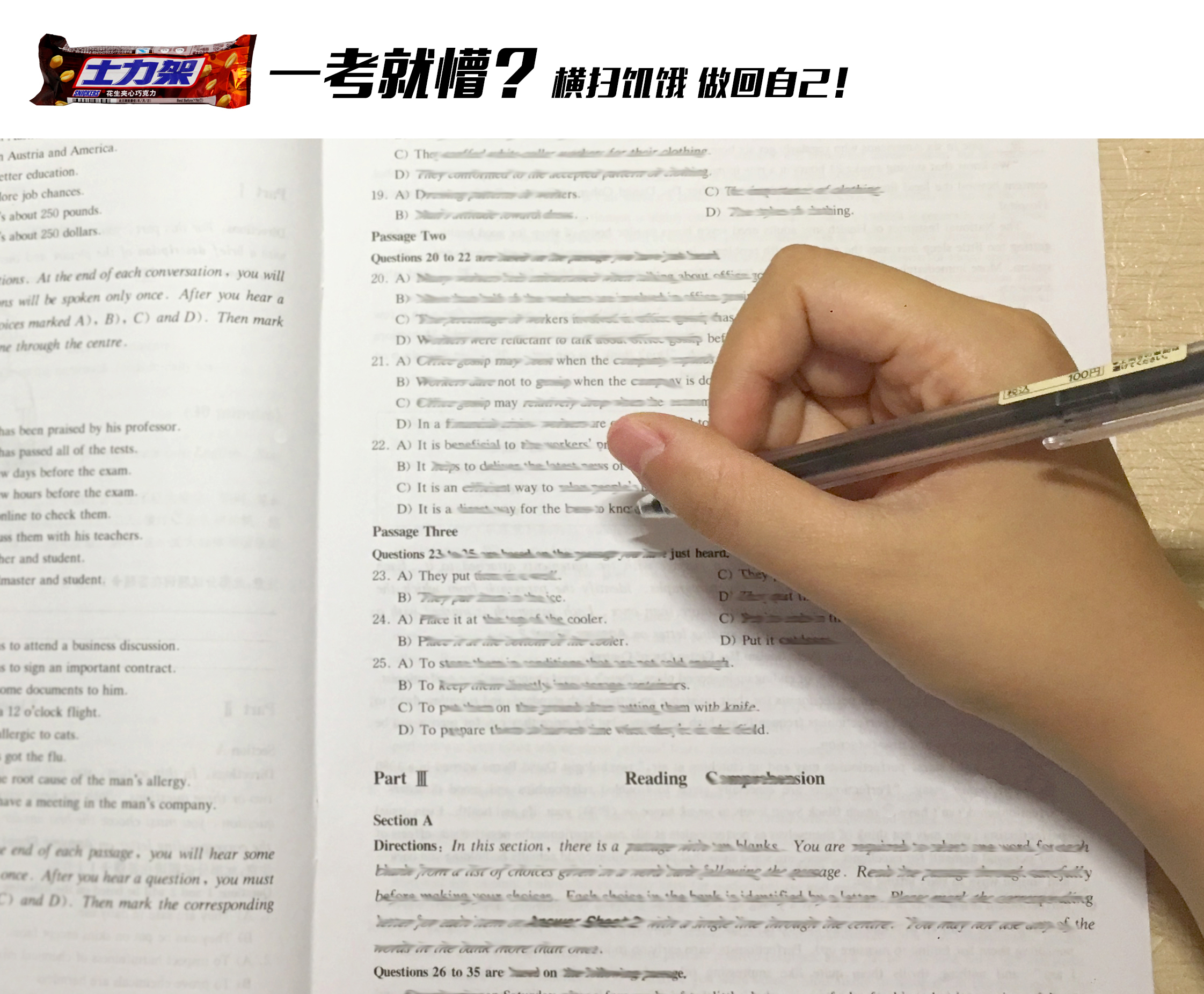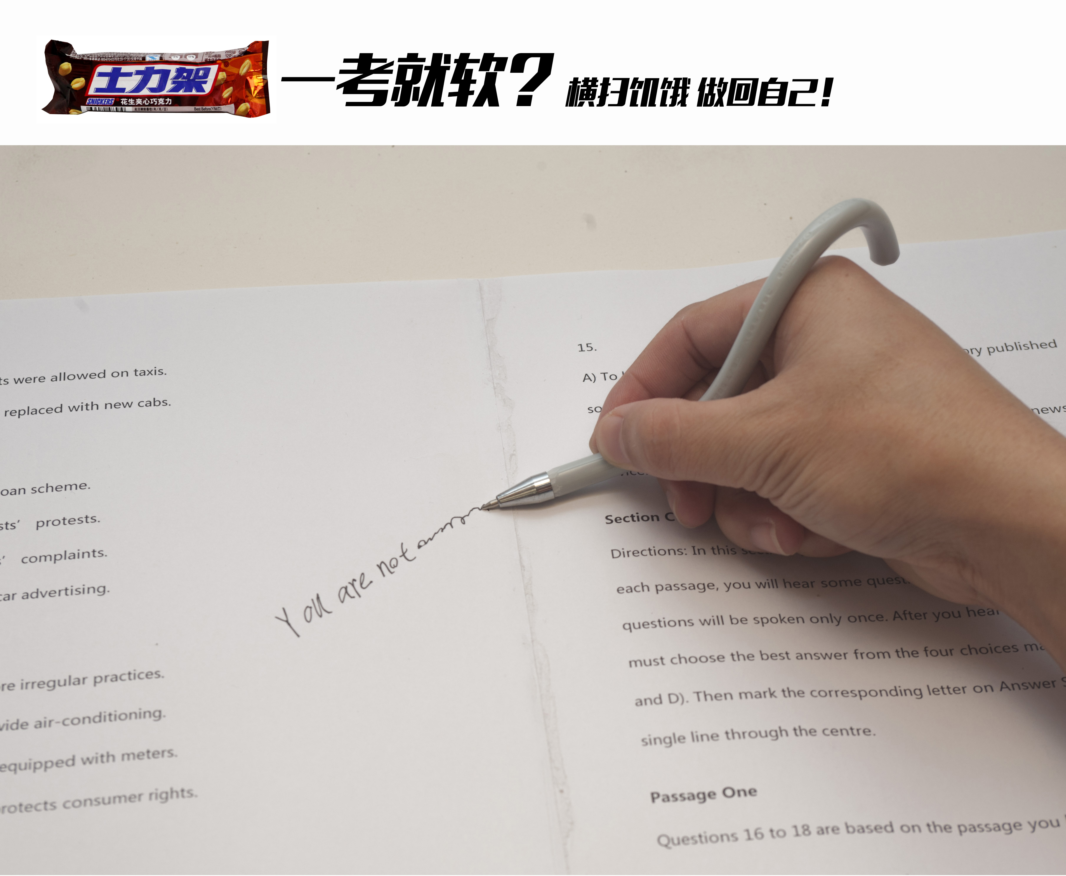 第一组设计,我们是以考试相关用品来做创意。 一考就软?连笔都软了,字都写不了……不如来条士力架,横扫饥饿,做回那个奋笔疾书快速答题的学霸!