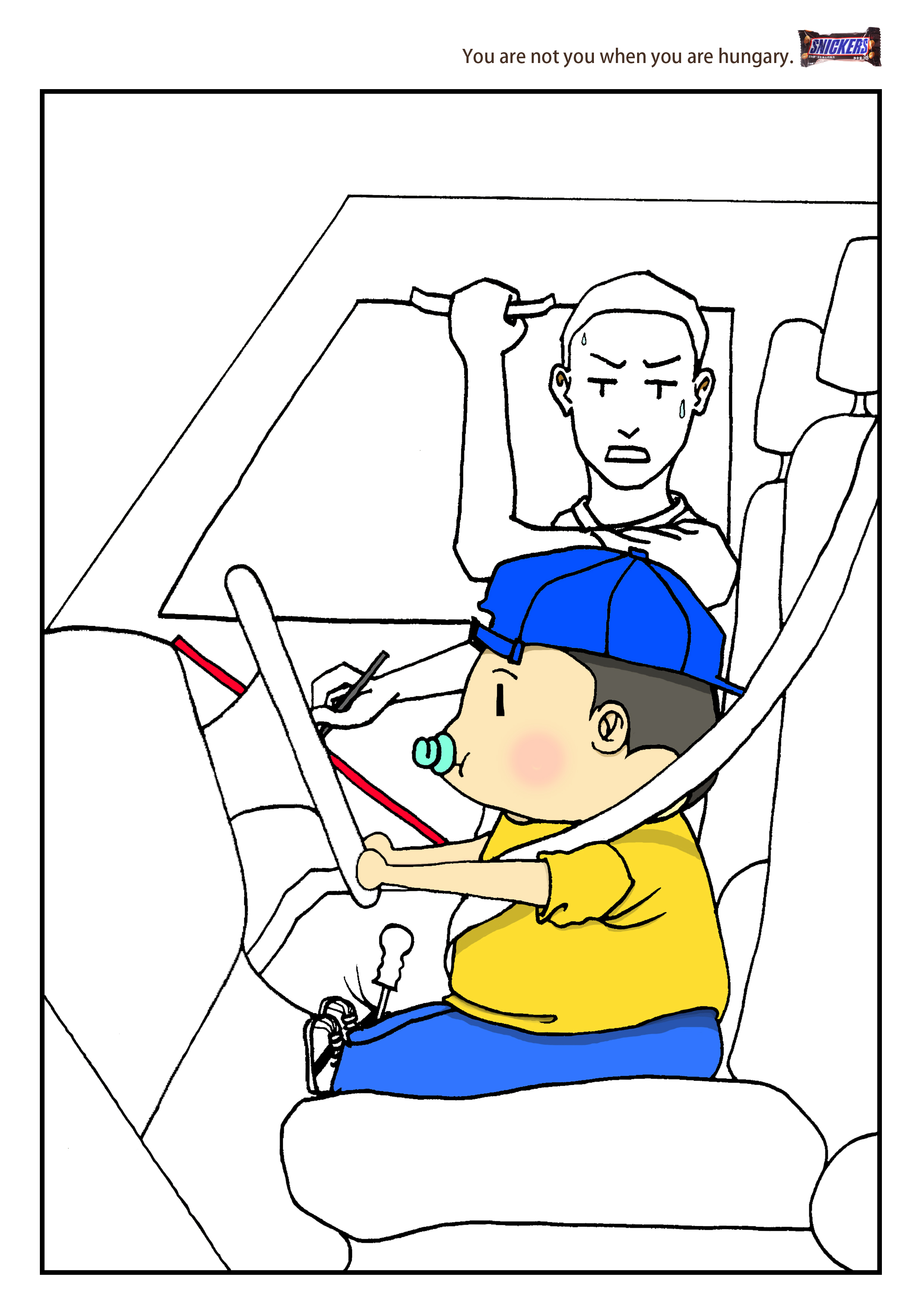 第三组设计是以收手绘形式表达,是以个人去考驾照时紧张的手心冒汗的状态而画的。 驾照考试时,小孩子开车,连油门刹车都踩不到,方向盘也就刚刚好摸到。表明了驾考学员状态极度不好的时候。放大了没吃士力架时可能会产生的问题——缺乏能量,退化成婴幼儿的自己。从而给予观看者一种概念:驾考之前吃条士力架,防止到时候饿的退化,还让监考的教练担心自己的生命安全。