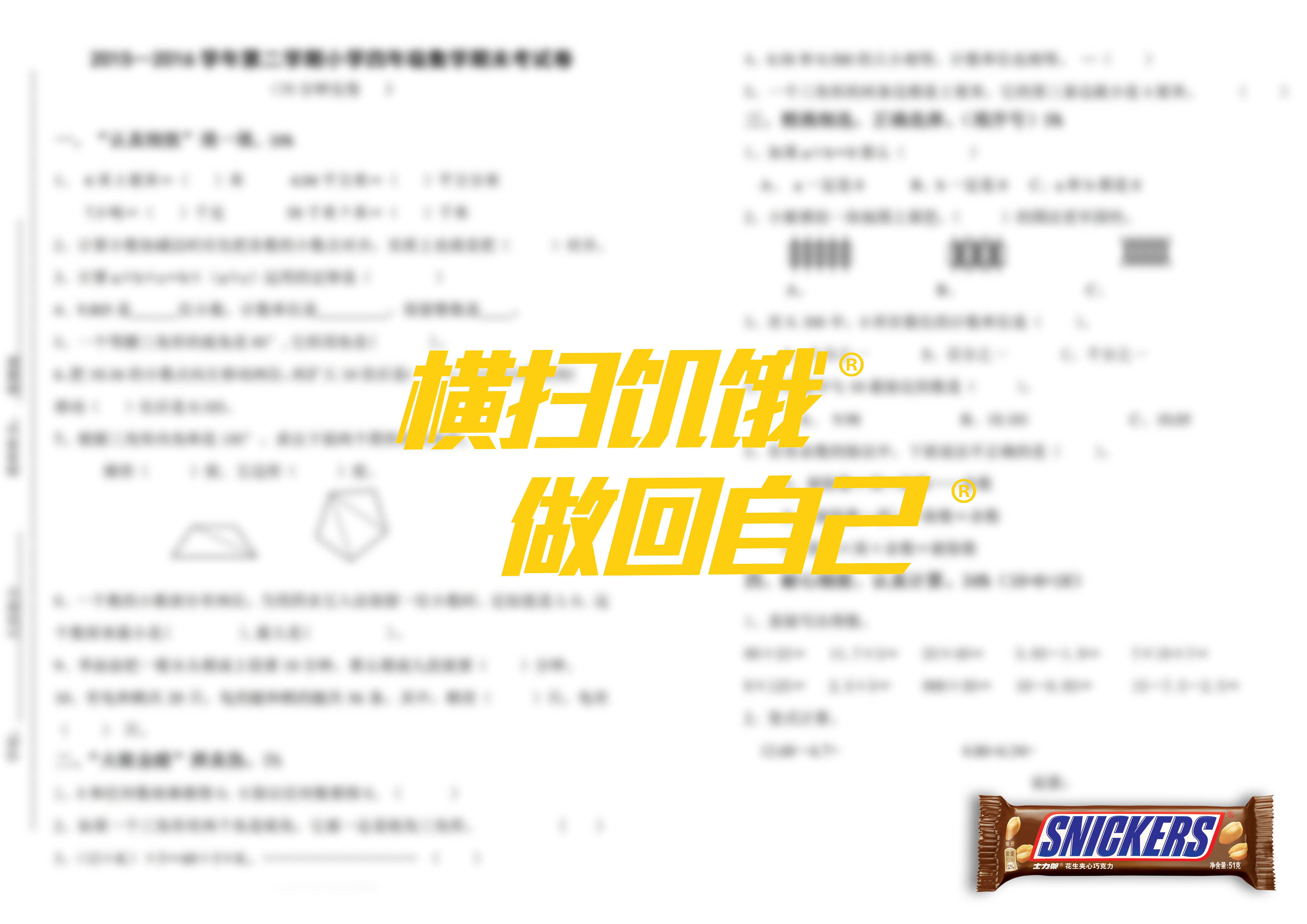 通过对试卷模糊的表现方法,表达出此时需要士力架补充体力。