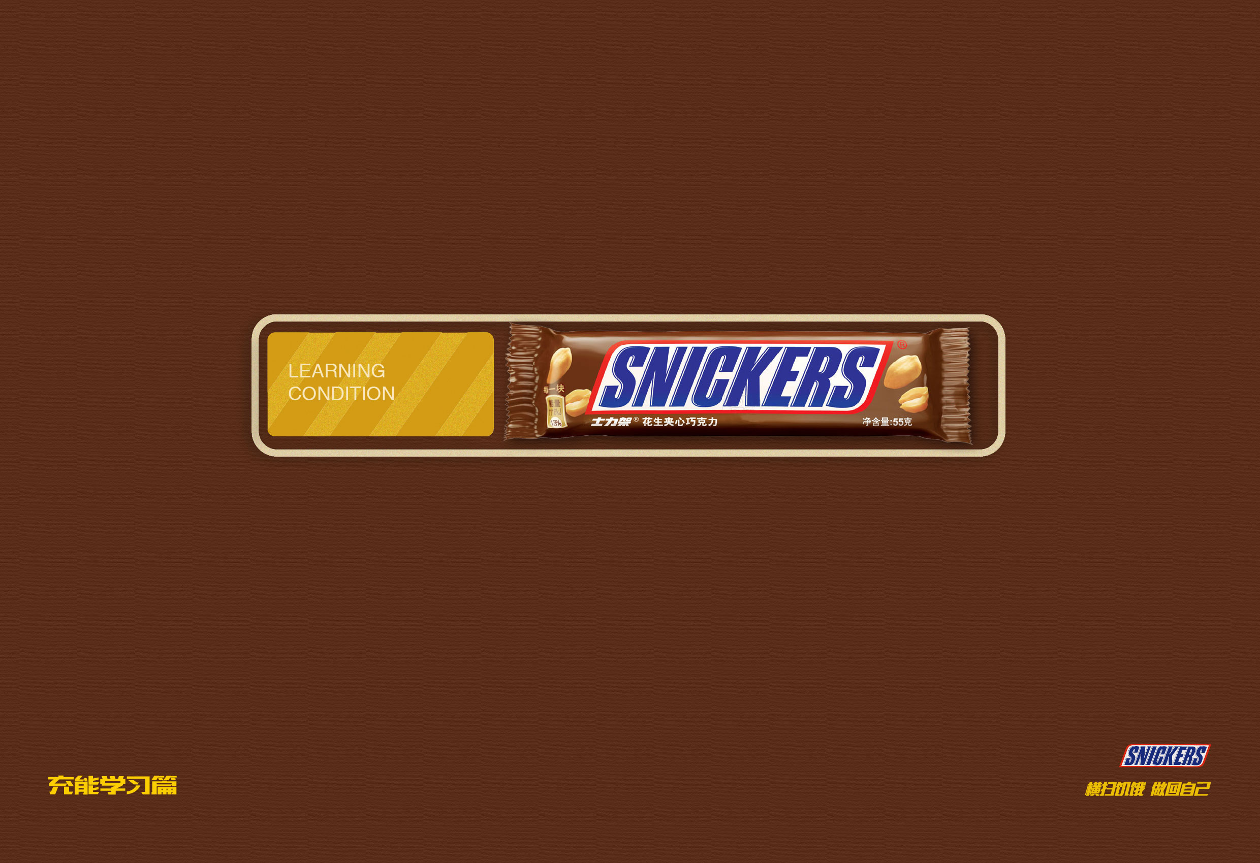 第一张为学习状态的创意海报,一个能量告急的状态栏,上面写着学习状态,表示学习的状态不佳,学生的能量不足,而状态栏空白的地方由士力架补满,表示着士力架可以补充学生的学习状态,帮助学生可以有更佳的学习状态。