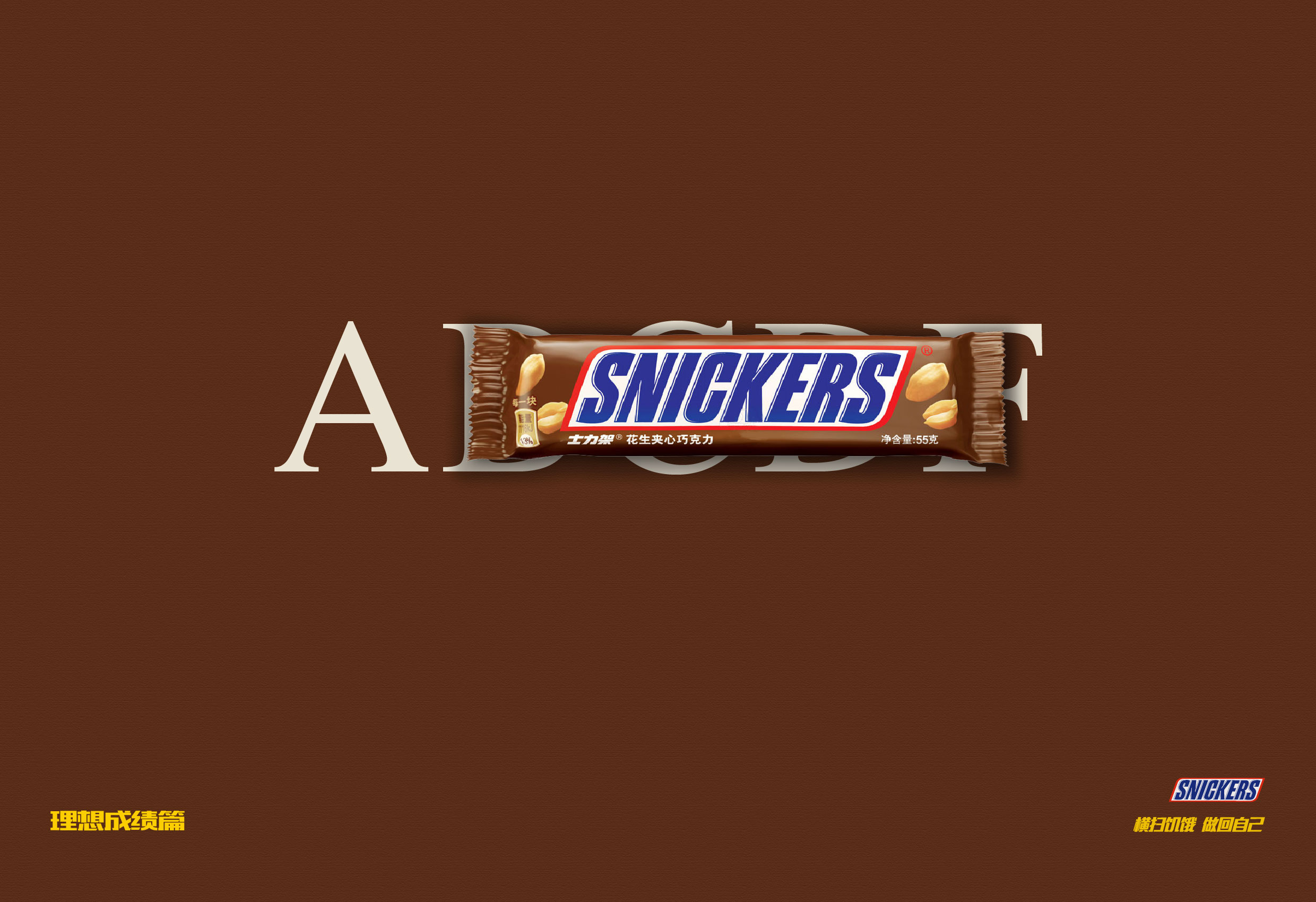 第二张是考试成绩方面做的创意,在国外的考试评分制度中,有ABCDF,A为最佳,F为最差,士力架挡住BCDF四个评分,直接表面士力架可以帮助你取得最好的成绩。