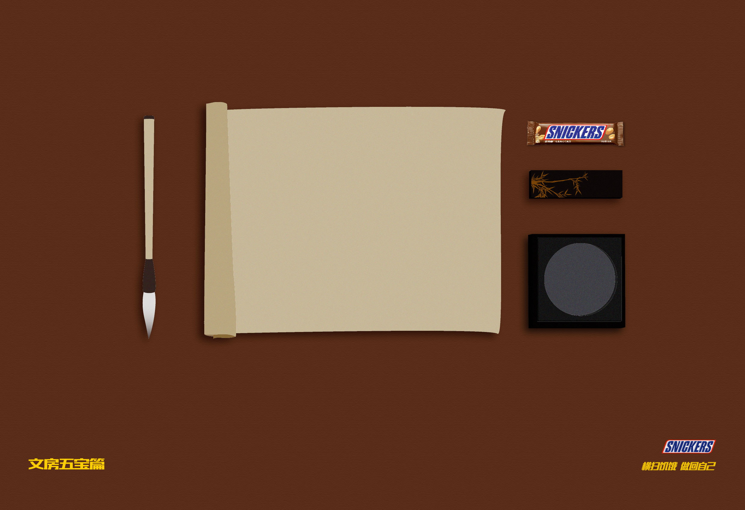 第三张为学习工具的创意海报,笔墨纸砚是伴随中国人几百上千年的学习工具,学习上离不开文房四宝,而加上士力架主要是表面它也是学生学习上不可或缺的一部分。