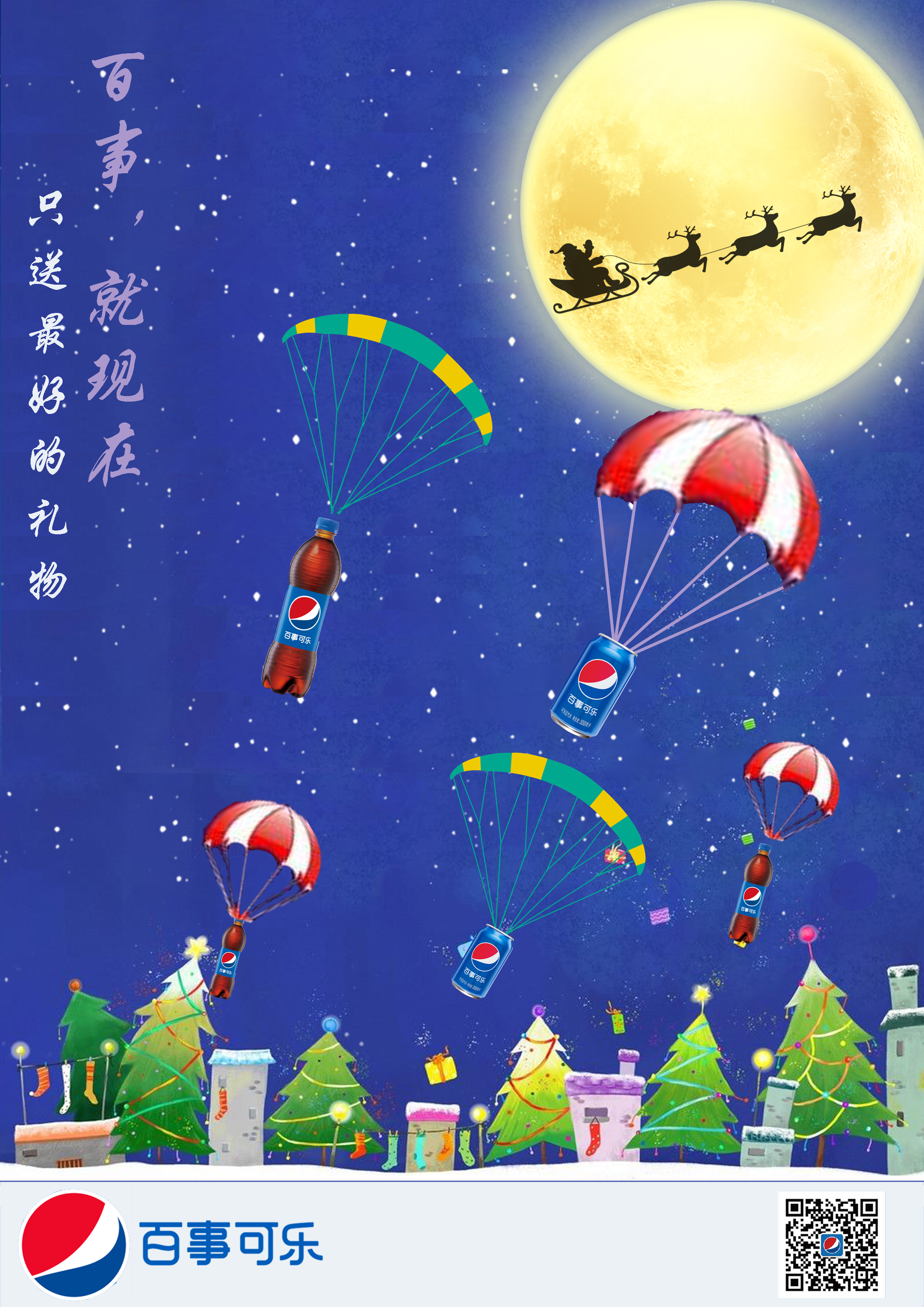 第一幅:《百事可乐》圣诞送礼篇 创意说明:用百事亮蓝的颜色做主体背景色,该作品引用了圣诞送礼,在明月星空的夜晚,驯鹿拉着雪橇,载着圣诞老公公从明月前驶过,与此同时从空中掉下来了圣诞礼物,精美的圣诞礼物(百事可乐)都以降落伞的形式降落。礼物落在了,每户家庭中。该作品的点睛之笔,是一句广告语“只送最好的礼物”,圣诞节是个美好的日子,在这天大家会实现愿望,会收到礼物。那么在圣诞节这天,百事可乐,作为最好的礼物的降落下来。