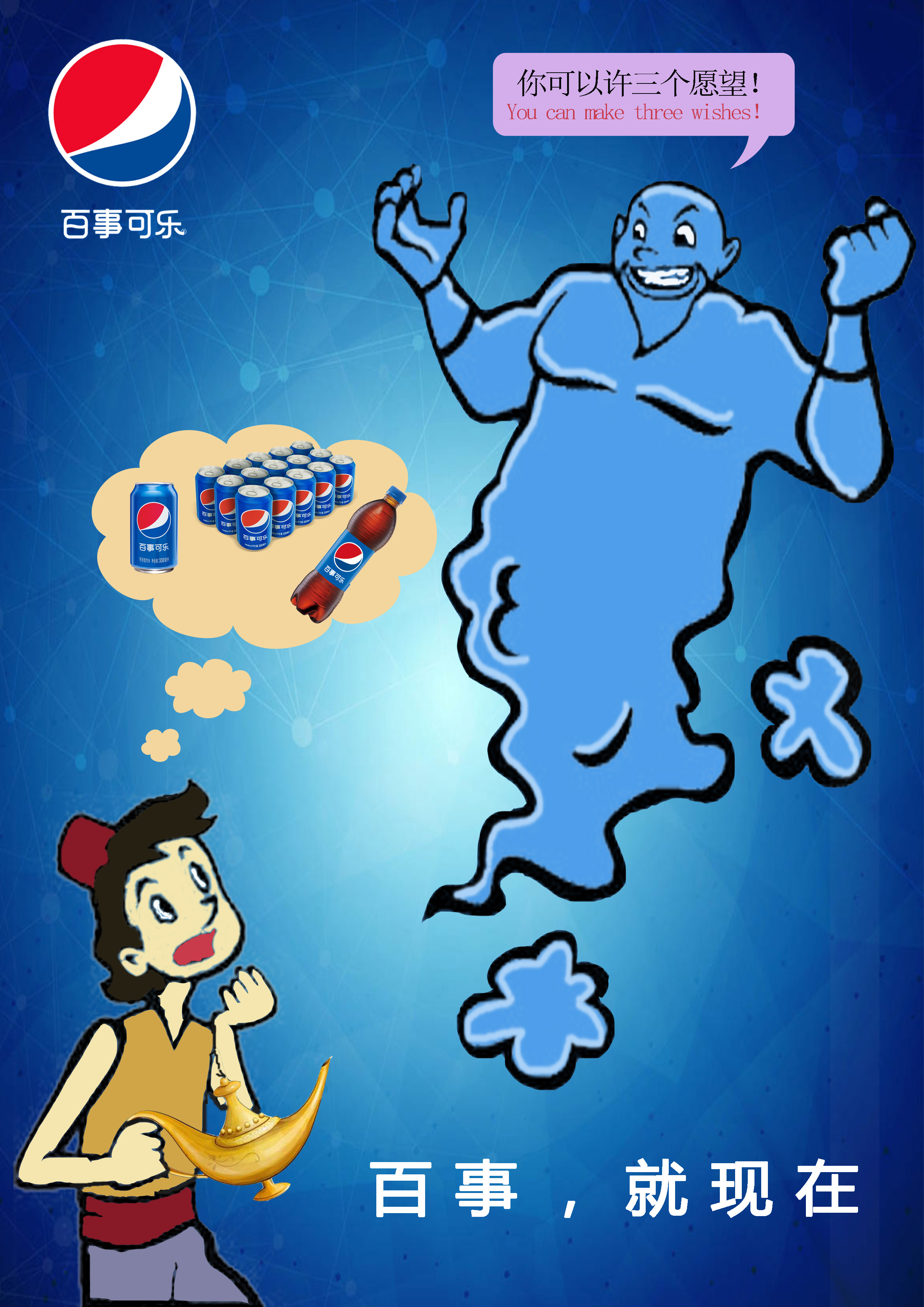 第二幅:《百事可乐》阿拉丁神灯许愿篇 创意说明:用百事亮蓝的颜色做主体背景色,该作品引用了阿拉丁神灯的故事,第一次捡到神灯的人,擦拭几下灯身,会有魔神出来,并会答应给放他出来的人三个愿望。画面中灯神告诉阿拉丁“你可以许三个愿望”。阿拉丁脑海想的是,一瓶,一罐,甚至是很多罐“百事可乐”。阿拉丁的愿望是“百事可乐”,胜过金银财宝,胜过功成名就。运用了诙谐幽默的方式,表现出来“百事可乐”有多受人们的喜爱。