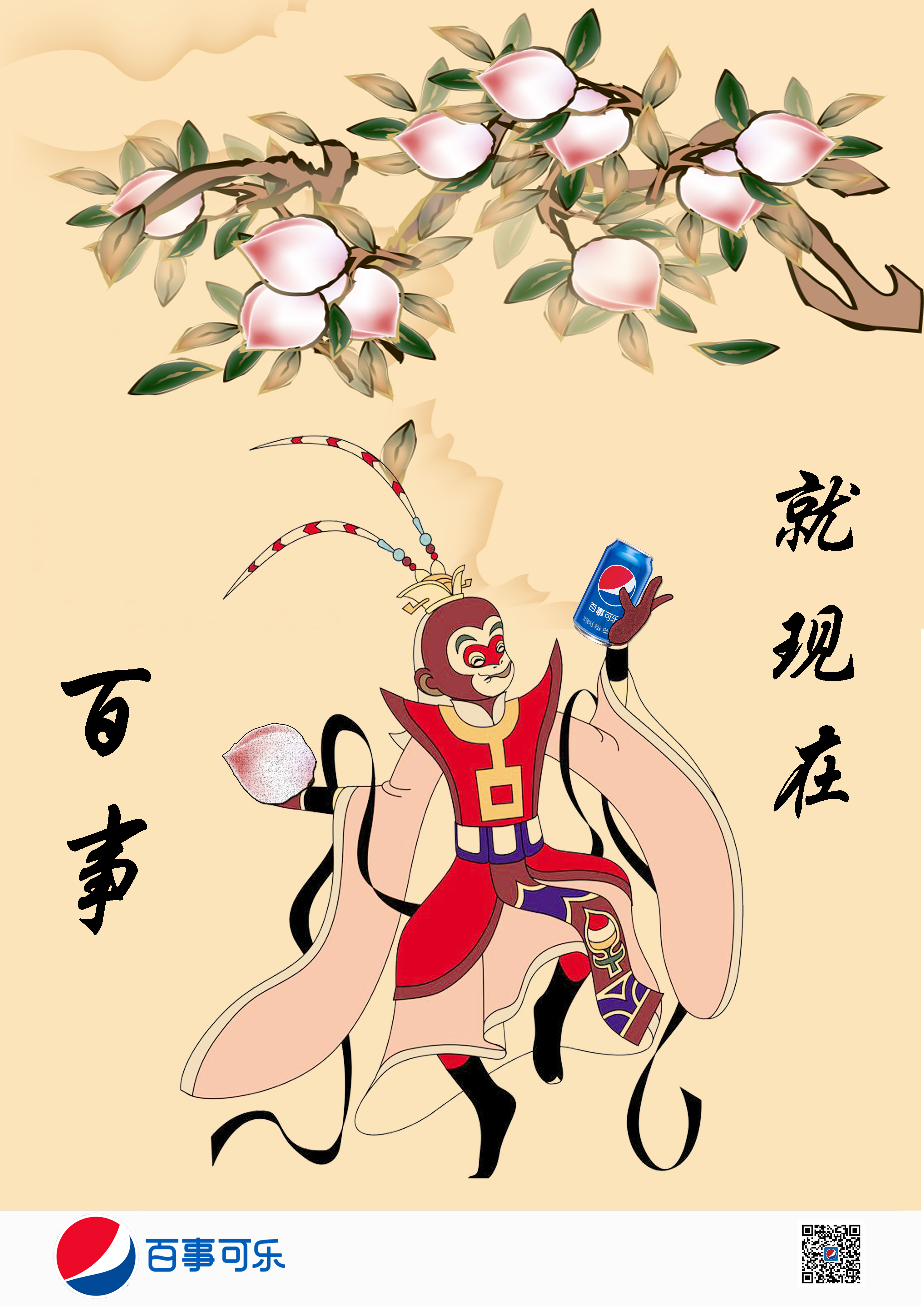 第三幅:《百事可乐》悟空篇 创意说明:本作品也是采用了诙谐幽默的剧情来描写“百事可乐”非常受人们喜爱。主画面为悟空在蟠桃树下右手拿着蟠桃,左手拿着“百事可乐”。众所周知悟空对蟠桃的喜爱程度有多深,可是在画面中,悟空的眼神一直是停留在“百事可乐”上的。可见百事可乐的魅力有多大。通过蟠桃与“百事可乐”的对比,更加突出表现“百事可乐”。