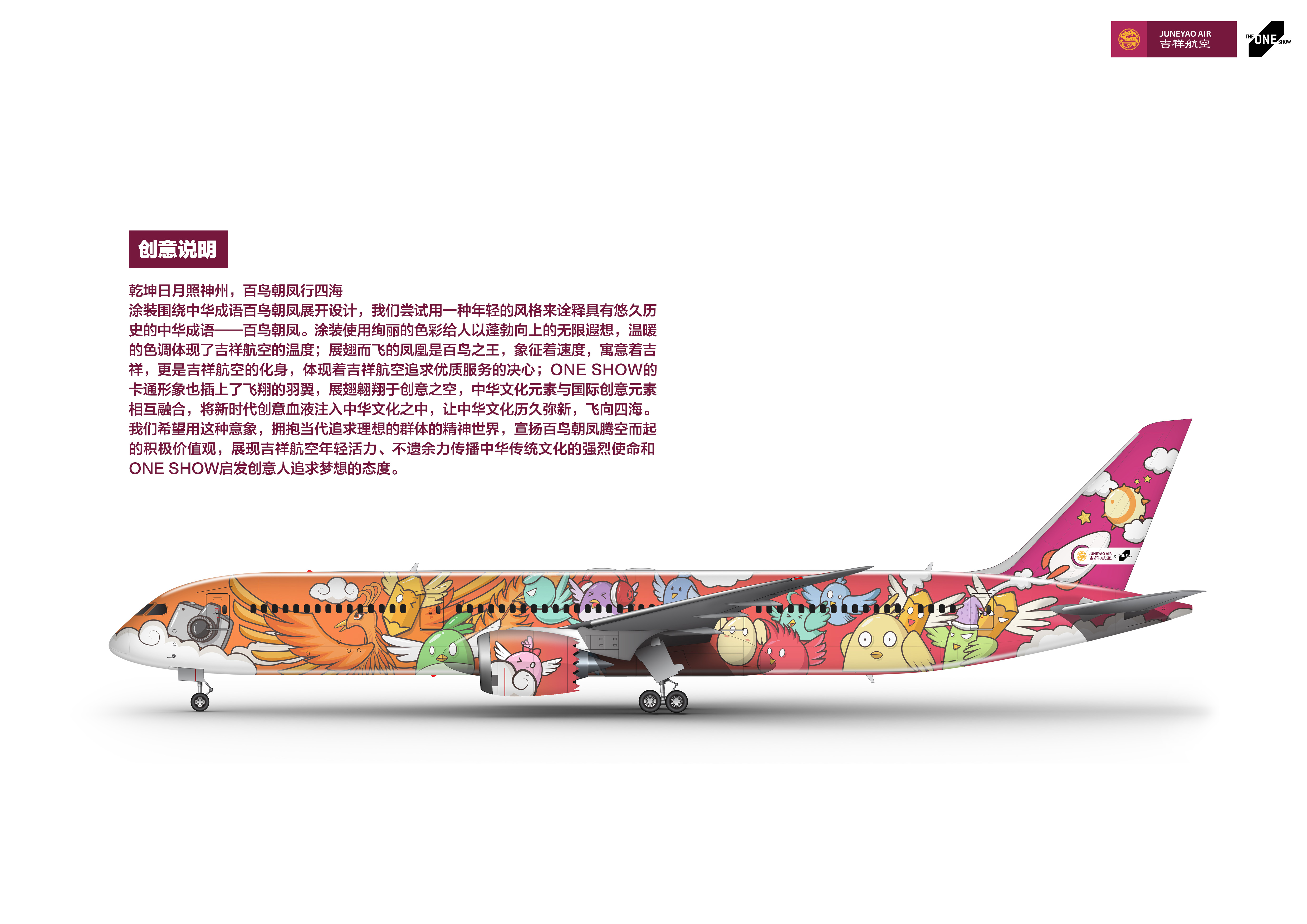 乾坤日月暖神州,百鸟朝凤行四海 涂装围绕中华成语百鸟朝凤展开设计,我们尝试用一种年轻的风格来诠释具有悠久历史的 中华成语——百鸟朝凤。涂装使用绚丽的色彩给人以蓬勃向上的无限遐想,温暖的色调体现了吉祥航空的温度;展翅而飞的凤凰是百鸟之王,象征着速度,寓意着吉祥,更是吉祥航空的化身,体现着吉祥航空追求优质服务的决心;ONE SHOW的卡通形象也插上了飞翔的羽翼,展翅翱翔于创意之空,中华文化元素与国际创意元素相互融合,将新时代的创意血液注入中华文化之中,让中华文化历久弥新,飞向四海。 我们希望用这种意象,拥抱当代追求理想的群体的精神世界,宣扬百鸟朝凤腾空而起的积极价值观,展现吉祥航空年轻活力、不遗余力传播中华传统文化的强烈使命和ONE SHOW启发创意人追求梦想的态度。