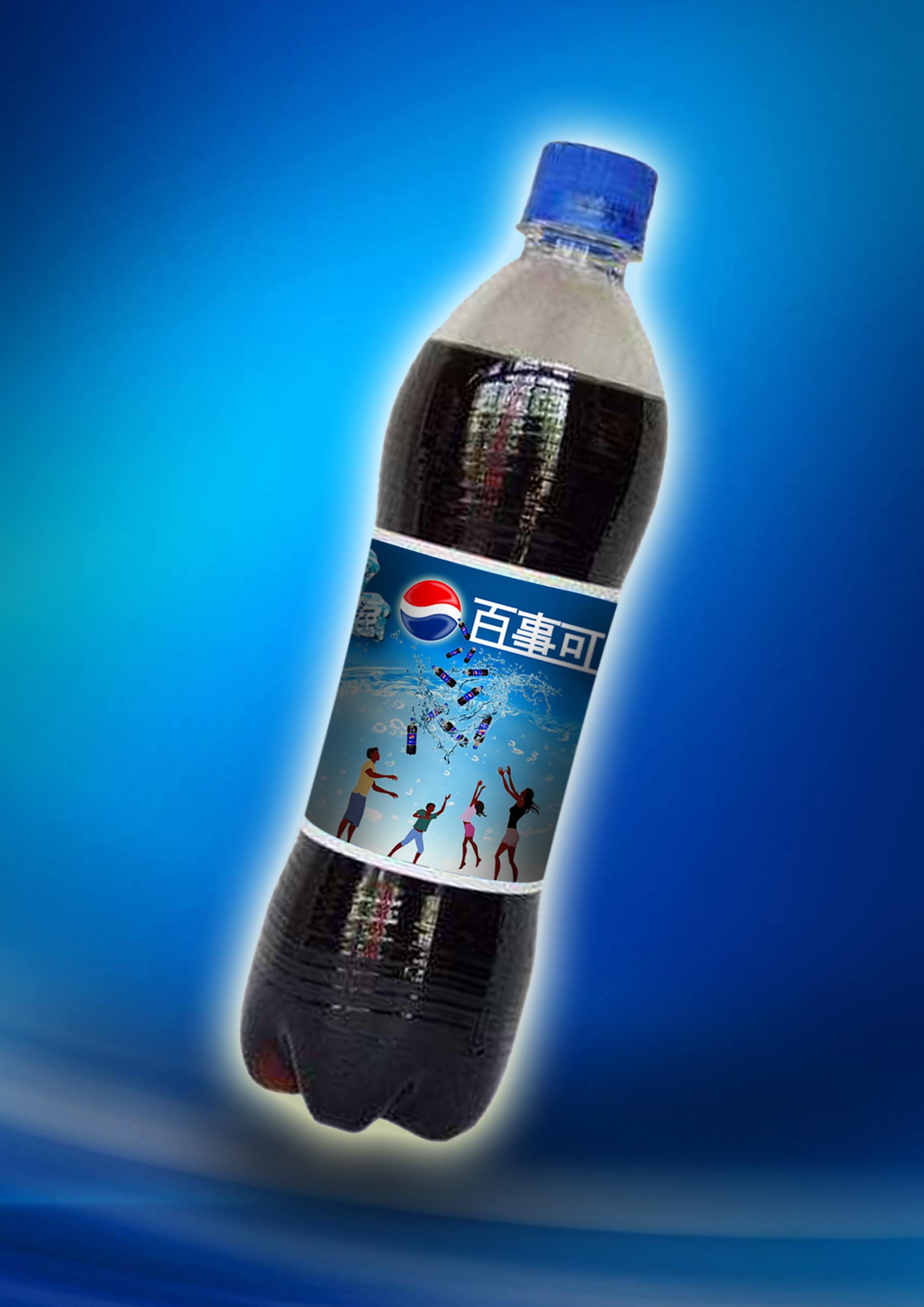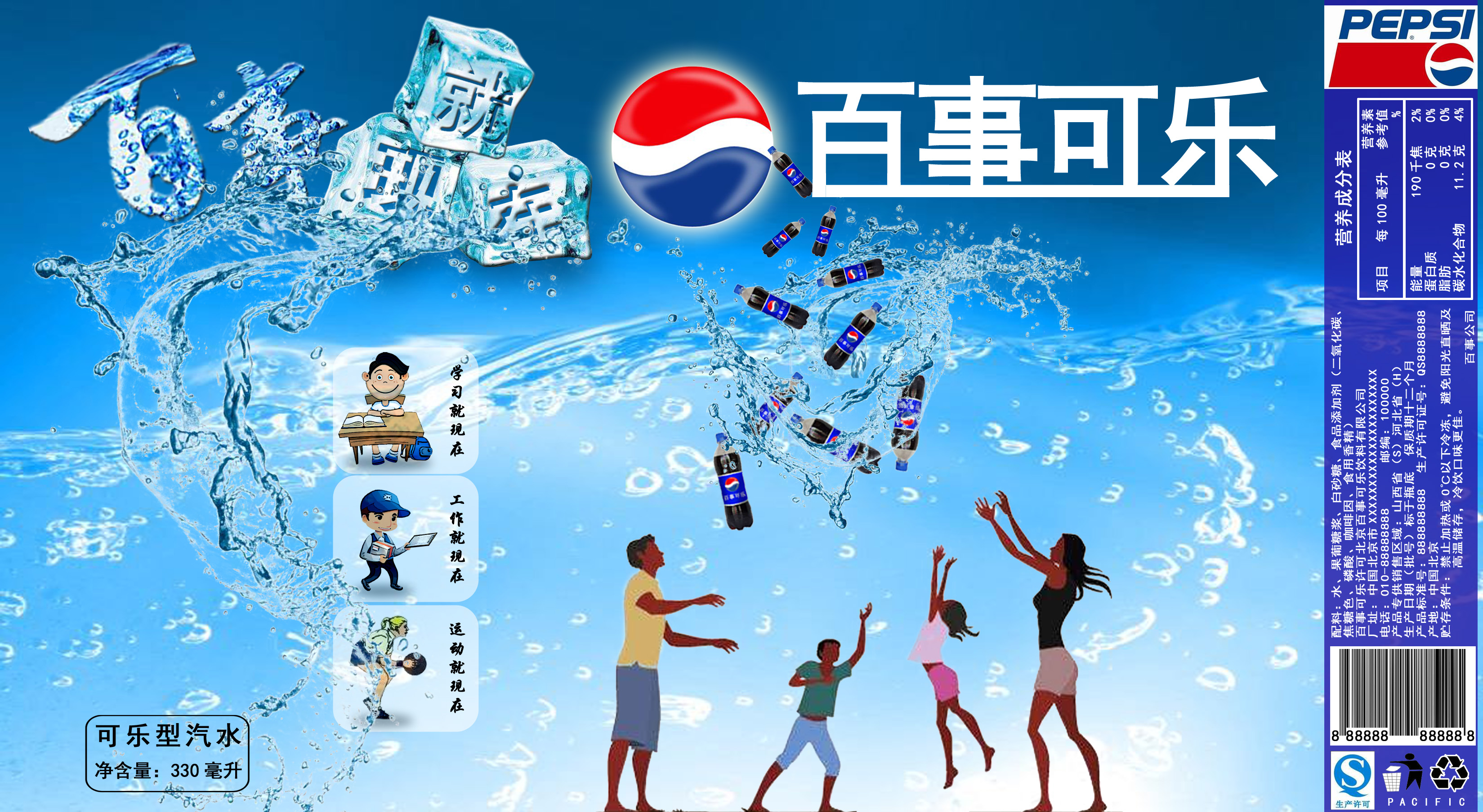 该作品做的是瓶装百事可乐的包装设计,画面以蓝色为主要基调,以冰和水为主要元素。封皮中展现了年轻人们将百事可乐抛在空中,体现了年轻人富有激情的生活态度,释放自己的内心,活在当下,享受快乐自由,符合百事可乐的品牌精神。