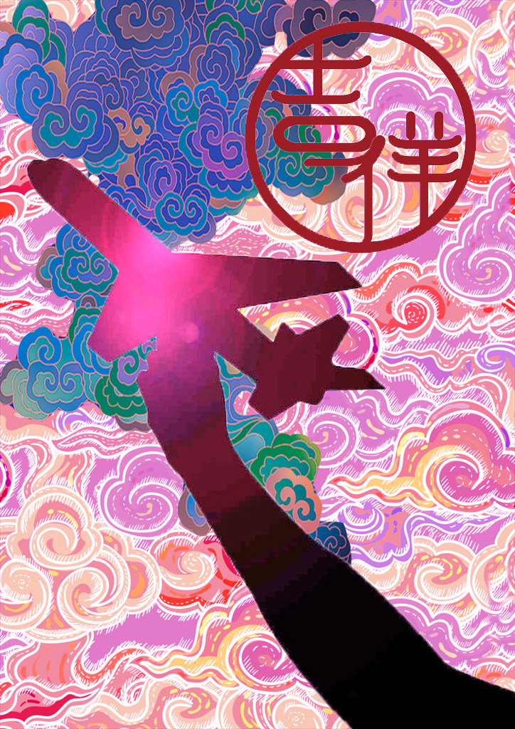 以祥云花纹作为背景 凸显中国风韵味 也呼应了吉祥航空的“祥”。 圆形吉祥logo则是表达了设计主旨。 最后,与背景颜色相称的手持飞机剪影则预示了吉祥航空今后更好的未来发展。整个作品设计更偏中国民族风,更具风格特色。