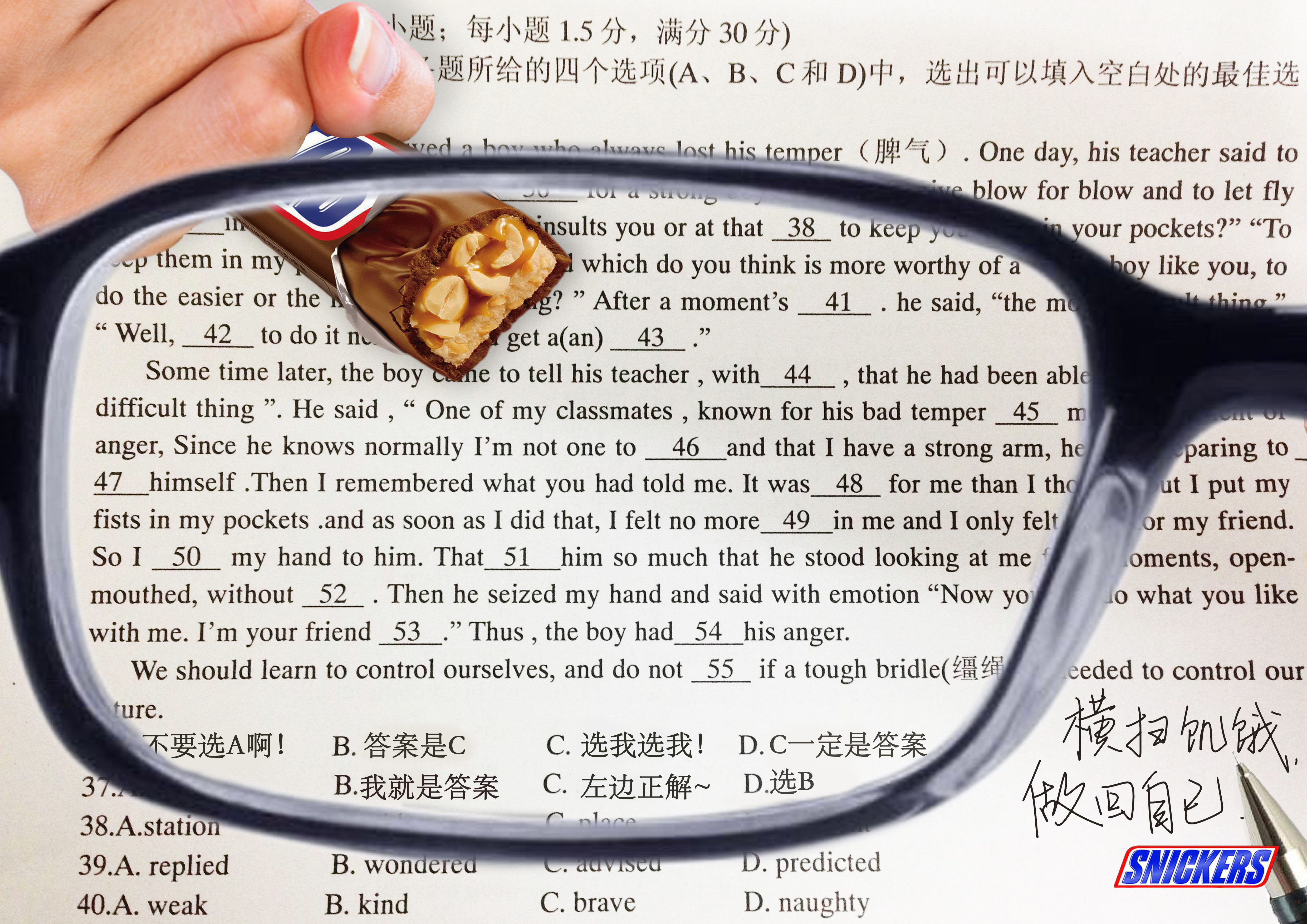 士力架——给你好看! 980 2257 0 设计,广告 分享 我的平面作品灵感来源于前段时间微博热门话题“学霸和学渣眼中的选择题”。左上角考生拿着刚被自己咬过的士力架。她可能迷茫过、焦虑过、失败过,但在她吃下士力架之后,立刻活力满满做回自己,考试也如有神助,选择题一目了然不再纠结。右下角是我想表达她自己写出士力架的slogan,流露出对士力架的认同和感谢,同时也是正能量的传递,吸引考生尝尝士力架。 赞一下 qiuduoduo 重庆市 关注 查看更多信息 ‹ › 发布