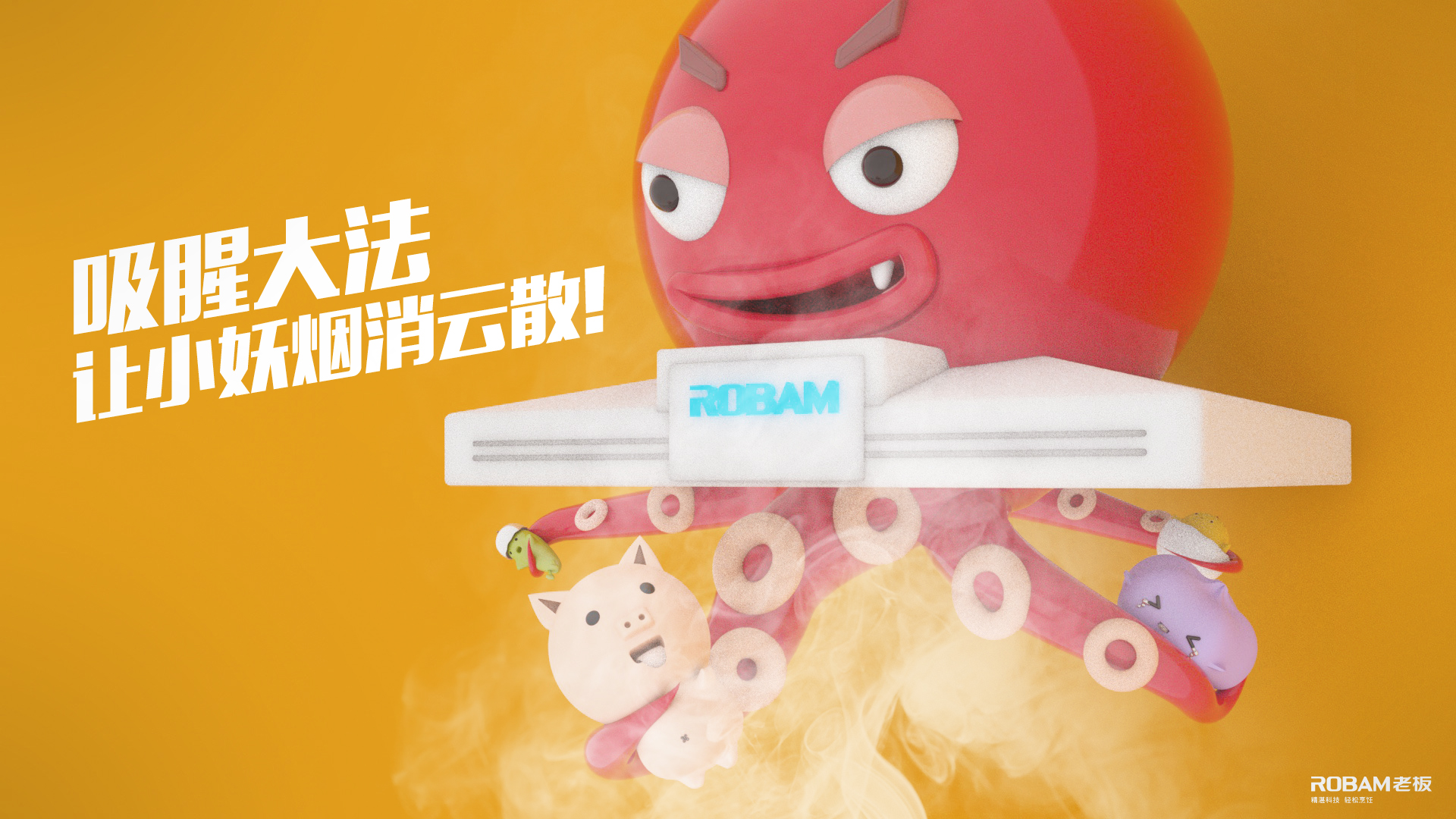 将味觉的烟视觉化拟人化展现出来,老板油烟机就像是一只大章鱼牢牢的吸住每一个刺鼻的烟味让你不再受烟雾打扰,好好享受厨房生活~