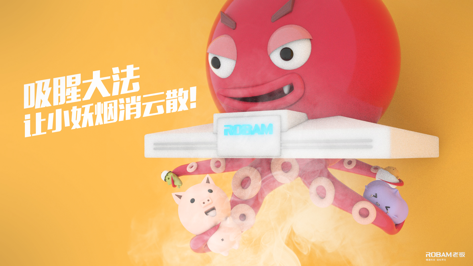 将味觉的烟视觉化拟人化展现出来,老板油烟机就像是一只大章鱼牢牢的吸住每一个刺鼻的烟味让你不再受烟雾打扰,好好享受厨房生活~