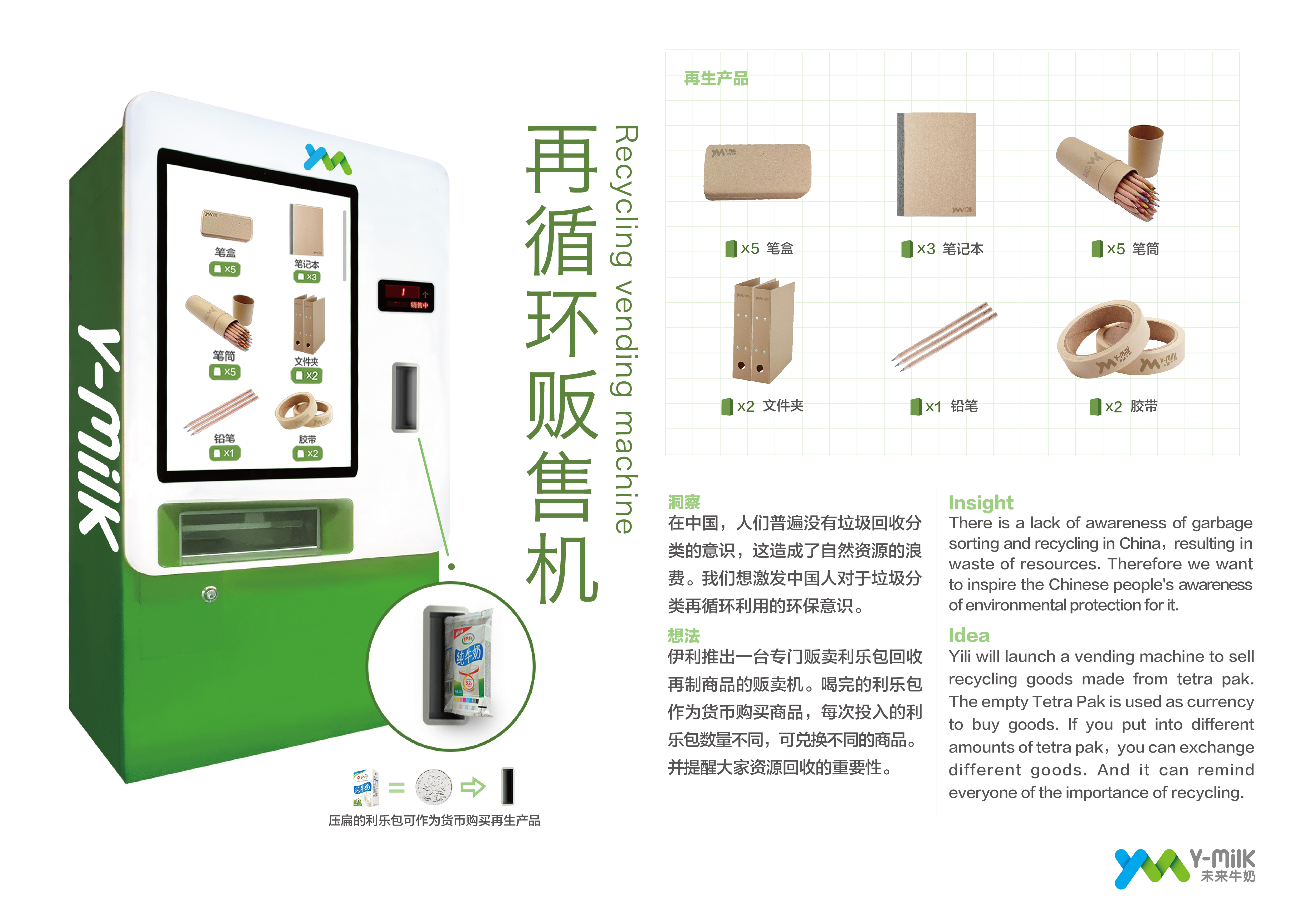 再循环贩售机 922 2835 0 设计,产品 分享 在中国,目前没有完善的废品回收制度,并且中国人也没有废品回收的意识,这造成了资源的浪费,我们想激发中国人对于垃圾分类再循环利用的环保意识。伊利推出再循环贩售机,这个贩售机以喝完后压扁的利乐包作为货币,可购买由利乐包制成的再循环商品。每个商品价格不同,需要投入不同数量的利乐包来购买。 赞一下 O.S.R.W ‹ › 发布