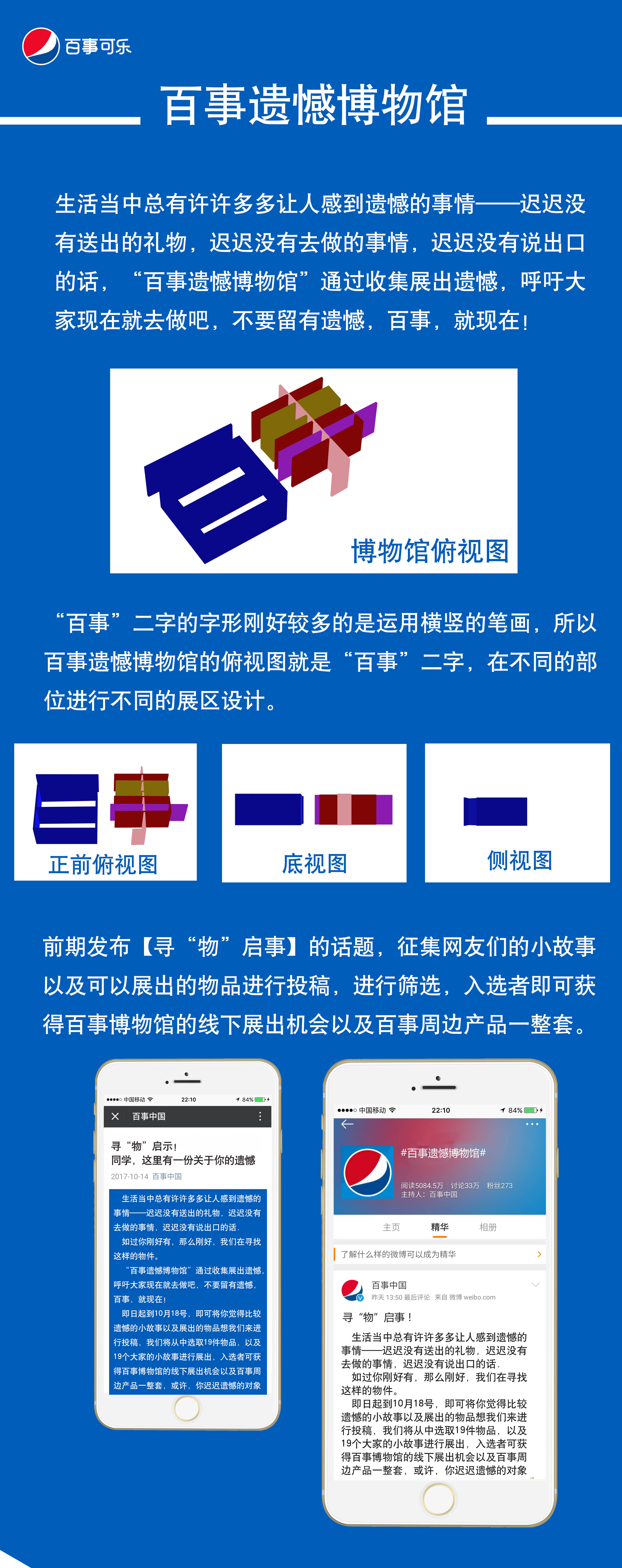 生活当中总有许许多多让人感到遗憾的事情——迟迟没有送出的礼物,迟迟没有去做的事情,迟迟没有说出口的话,“百事遗憾博物馆”通过收集展出遗憾,呼吁大家现在就去做吧,不要留有遗憾,百事,就现在! 展区设计:“百事”二字的字形刚好较多的是运用横竖的笔画,所以百事遗憾博物馆的俯视图就是“百事”二字,在不同的部位进行不同的展区设计。 线上创意推广:前期发布【寻“物”启事】的话题,征集网友们的小故事以及可以展出的物品进行投稿,进行筛选,入选者即可获得百事博物馆的线下展出机会以及百事周边产品一整套。