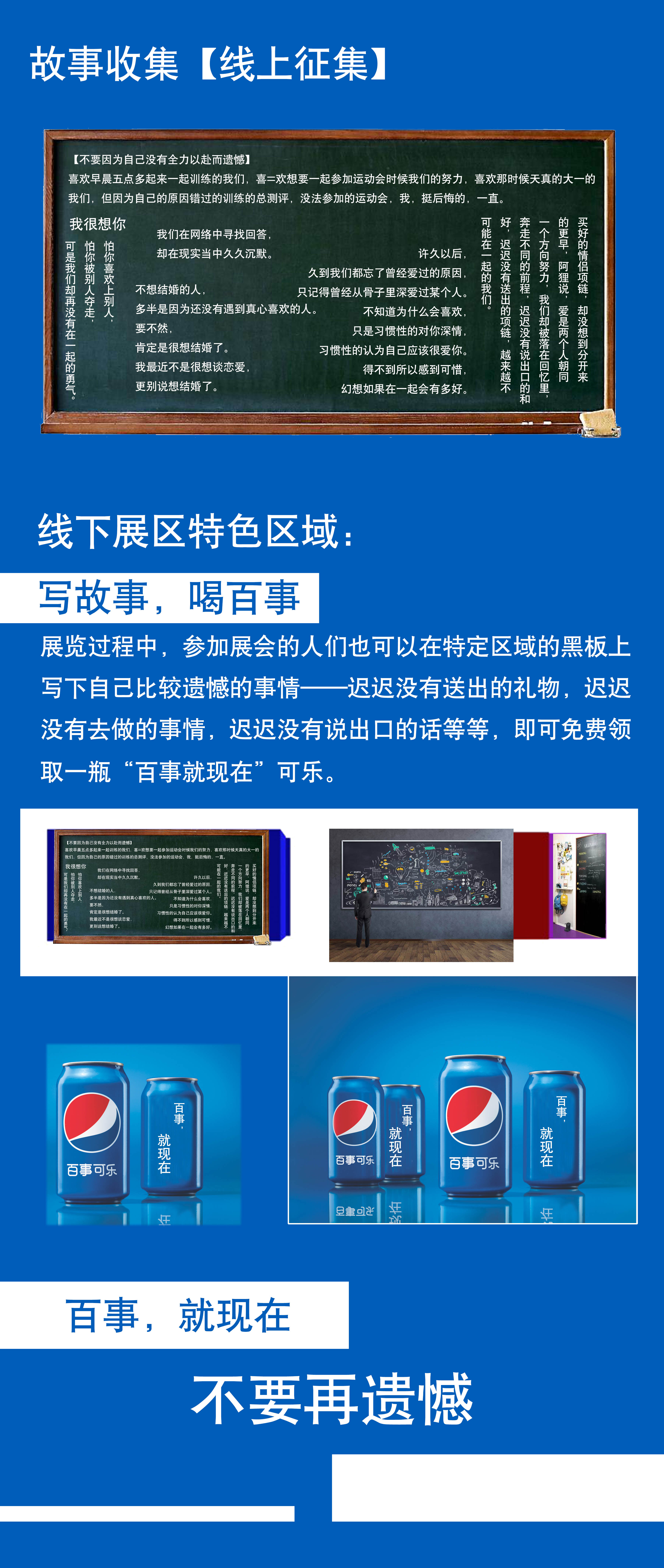 线上征集的故事的展示以及特色区域。 展览过程中,参加展会的人们也可以在特定区域的黑板上写下自己比较遗憾的事情——迟迟没有送出的礼物,迟迟没有去做的事情,迟迟没有说出口的话等等,即可免费领取一瓶“百事就现在”可乐。