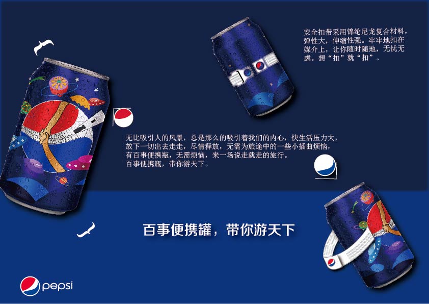 百事,连接世界两端的你我 994 2853 0 百事便携罐,伴你游天下 分享 无比吸引人的风景,总是那么地吸引着我们的内心。快生活压力大,放下一切出去走走,尽情释放,无需为旅途中的一些小插曲烦恼。有百事便携罐,无需烦恼,百事便携罐,伴你游天下。 出门在外还在为车上没车篓而烦恼? 忘带背包东西没地方放而烦恼? 不用烦恼百事便捷瓶帮你解决。 baishi,一路无忧! 还在为提重物烦恼么? 还在为盒子袋子突然坏掉苦恼? 不用烦恼,也别苦恼,有百事便携瓶帮你解决 赞一下 杨柳依依 ‹ › 发布