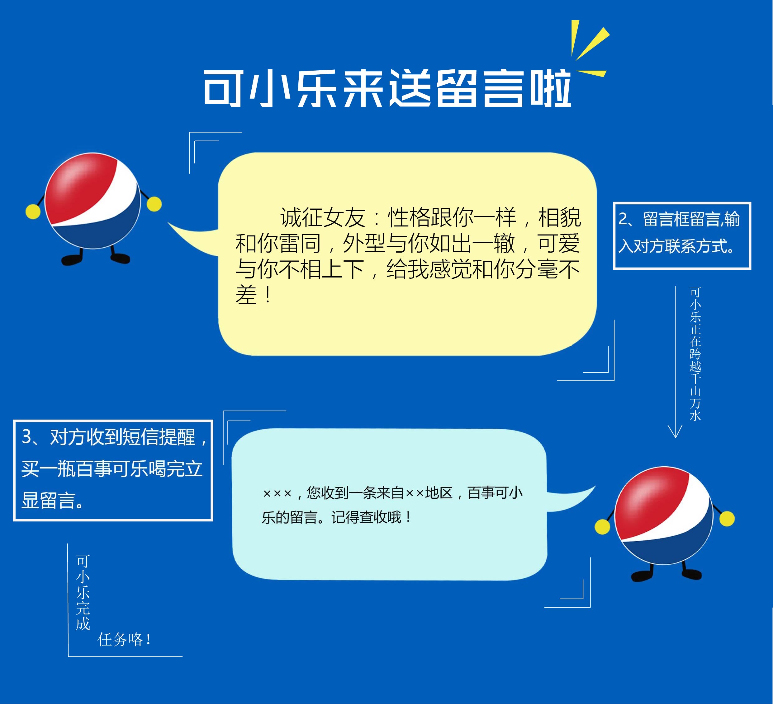 冰与火的青春 949 3094 0 产品创新 分享 打开手机扫一扫,百事可小乐为您打开留言框。 留言文字、对方手机号输入完成,对方收到百事可小乐的消息提醒。 喝完系列款百事可乐,留言自动显示于罐体(底色、图案可自定义)。 赞一下 晶@迎 ‹ › 发布