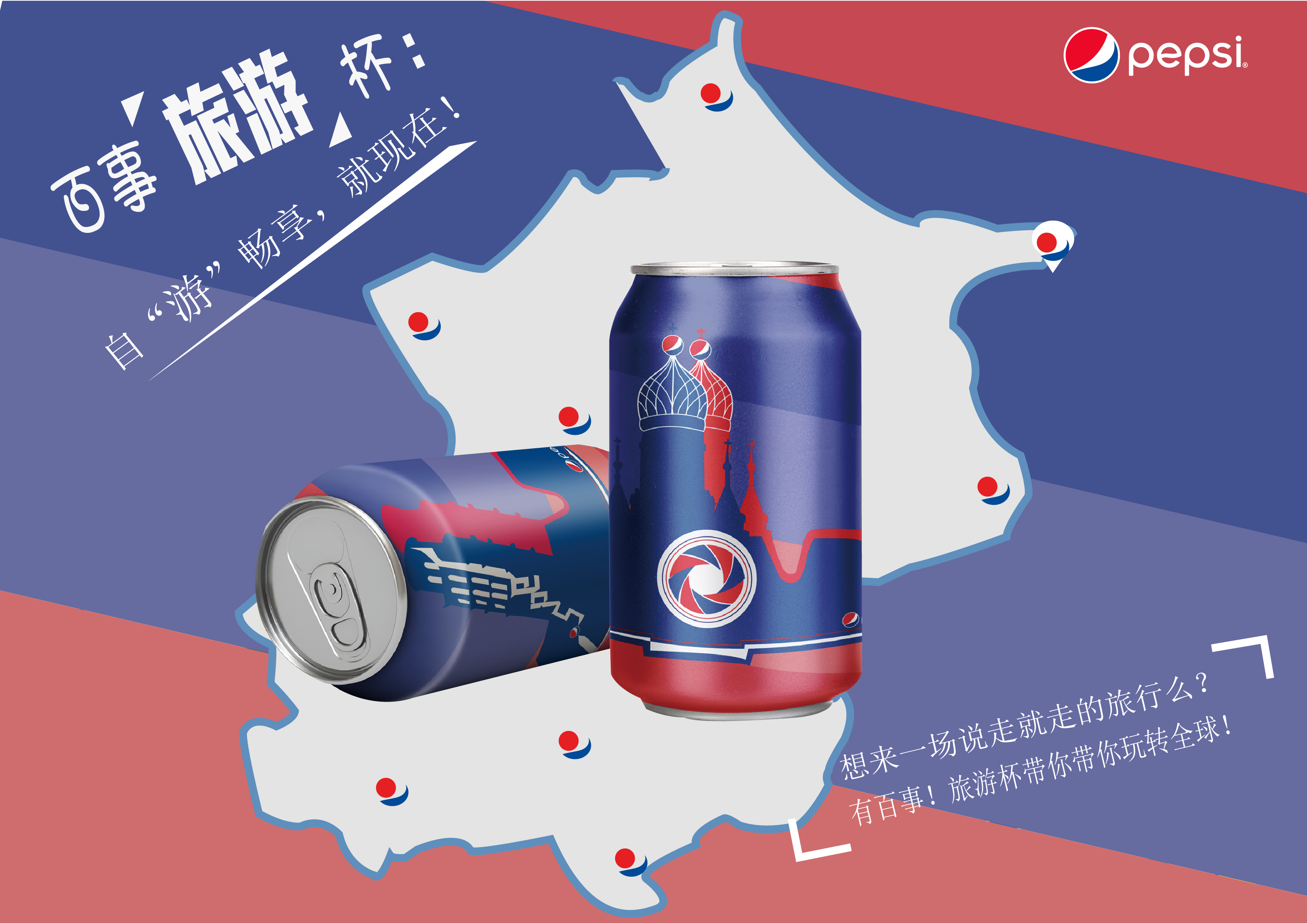 展示瓶体装潢,世界建筑奇迹比萨斜塔,索菲亚大教堂与相机相结合,代表旅游所记录的每个精彩瞬间,奇迹时刻在发生,与百事企业创新理念相呼应。再与百事主体色结合,达到更好的视觉效果。