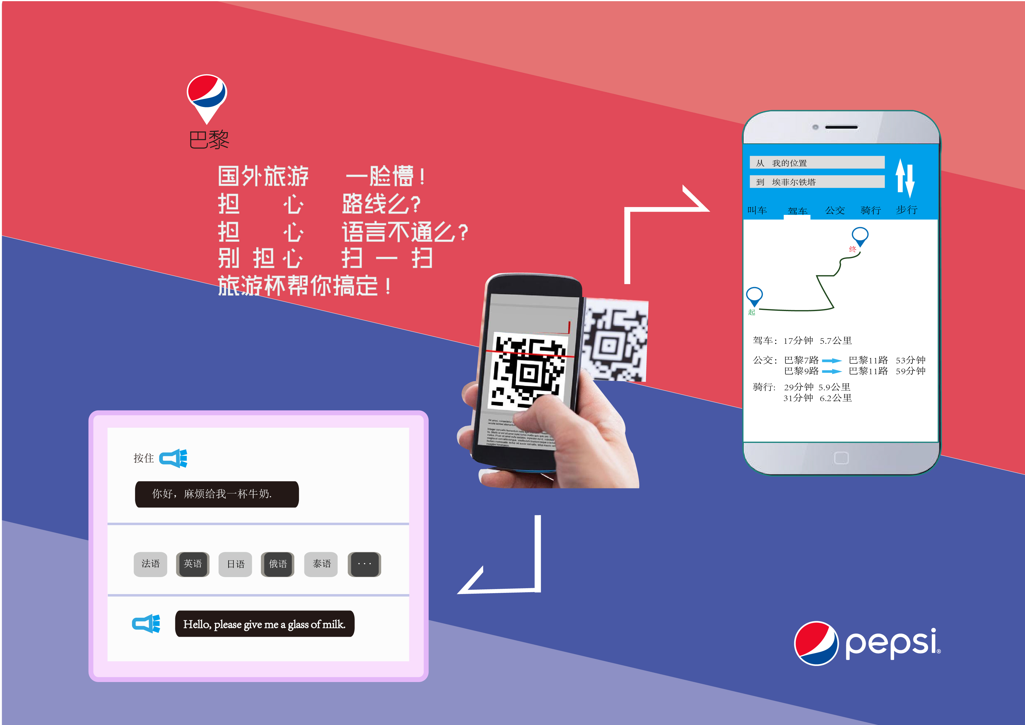 扫描瓶身二维码,具体介绍出行路线与所需时间。又有语音翻译帮出行者解决国外旅游语言不通的问题,简洁方便避免众多尴尬瞬间。