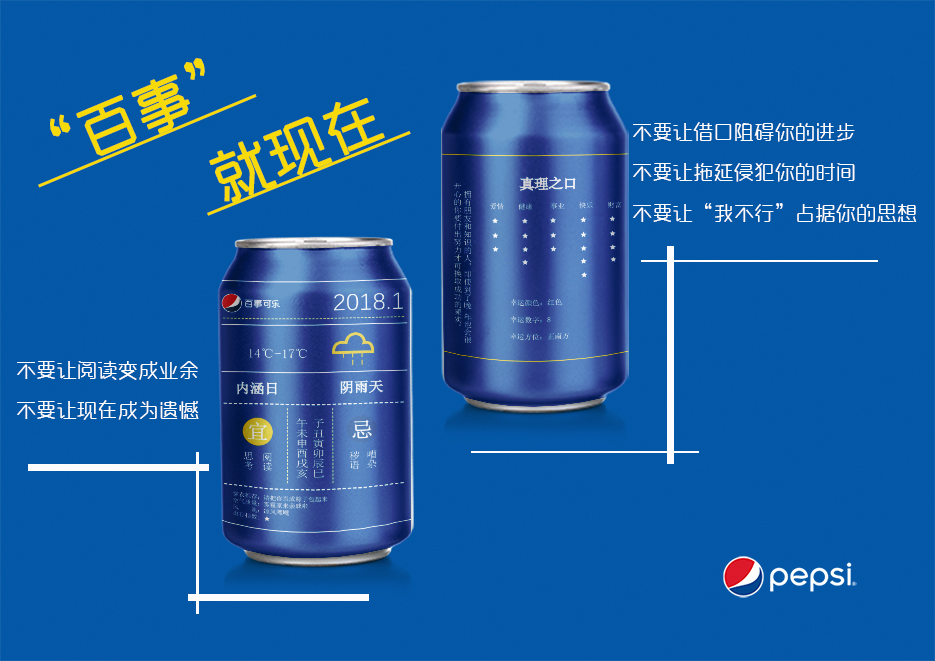 “百事”天天荐 罐体装潢是以中国传统日历版式为基础,在此之上进行置换改编,正面是每日最新天气温度实时更新。保留传统日历的黄历部分,每日“宜”“忌”清晰推荐。 背面是掌纹手相分析指点,从手掌纹路告诉你今日运程,为你一天的生活增加自信和保障,并为你提供处事建议。 “百事”天天推荐。