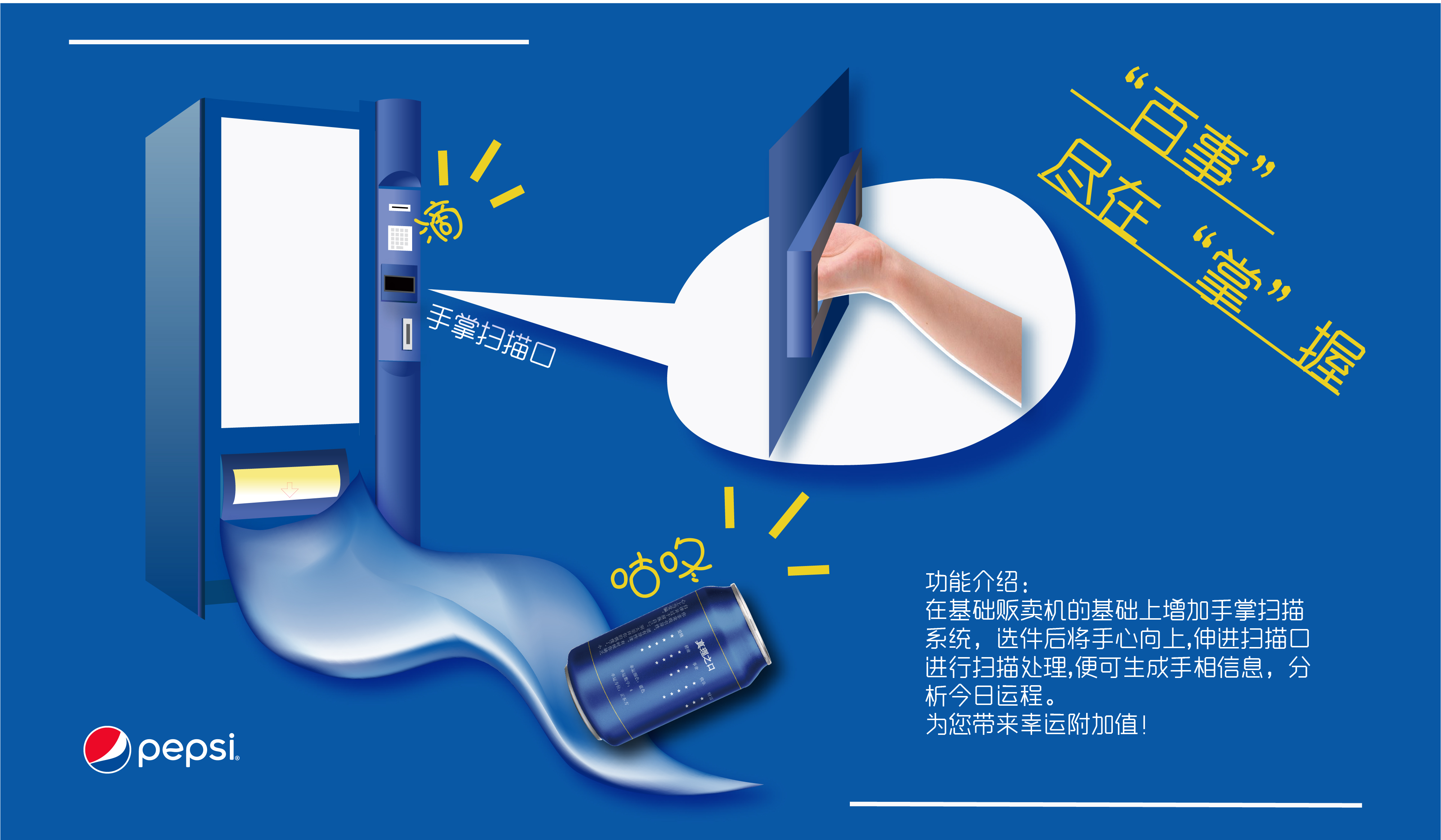 定制专属百事售卖机,给你不一样的体验。 投币后选件,选件成功后将手掌心向上,伸入手掌扫描口,“滴”声后拿出,便可生成罐体背面信息,今日运程分析。“百事”尽在“掌”握,抓住现在,掌握命运。 设计将传统的日历版式与现代的扫描科技巧妙结合,外观简单大方,内容趣味十足。符合主题“创新、有趣”。