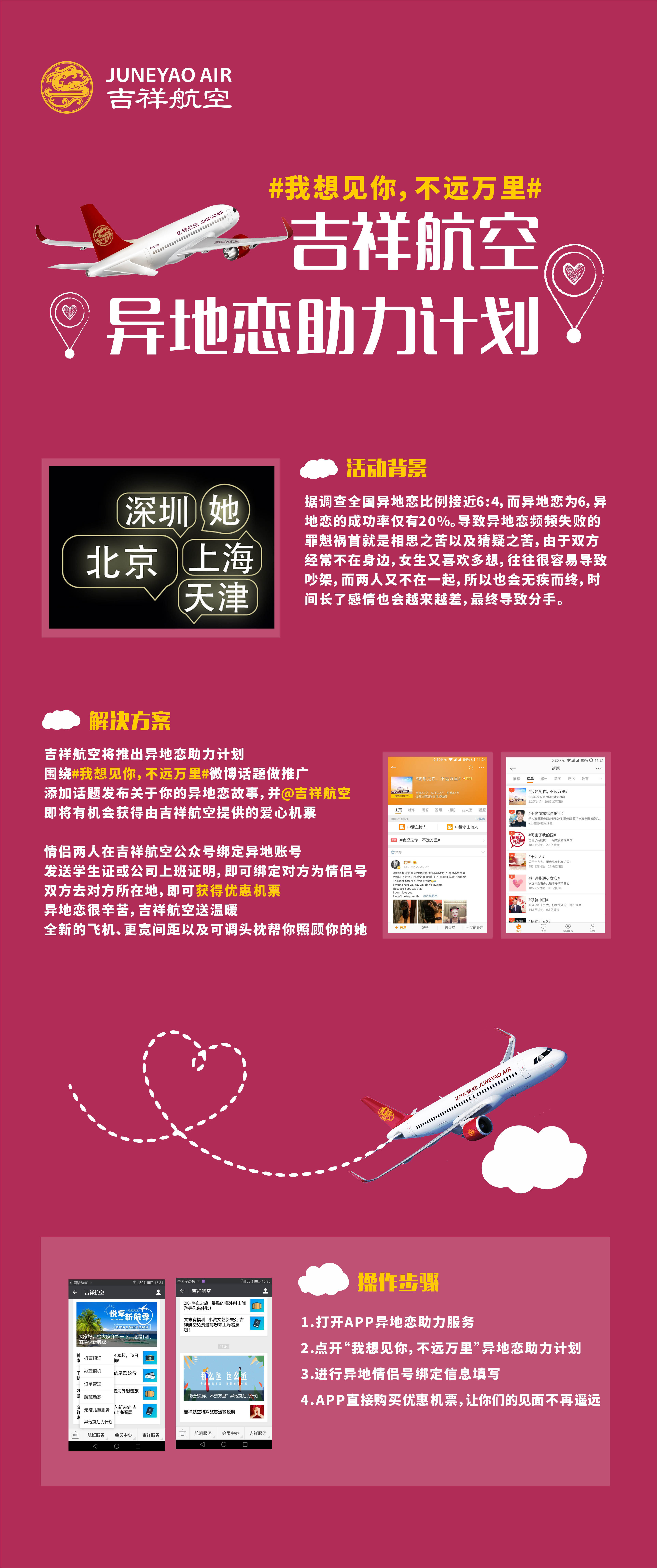 吉祥航空异地恋助力计划 206 2488 0 社会公益 分享 据调查全国异地恋比例接近6:4,而异地恋为6,异地恋的成功率仅有20%。导致异地恋频频失败的罪魁祸首就是相思之苦以及猜疑之苦,由于双方经常不在身边,女生又喜欢多想,往往很容易导致吵架,而两人又不在一起,所以也会无疾而终,时间长了感情也会越来越差,最终导致分手,因此推出异地恋助力计划公益活动。 赞一下 Vision ‹ › 发布