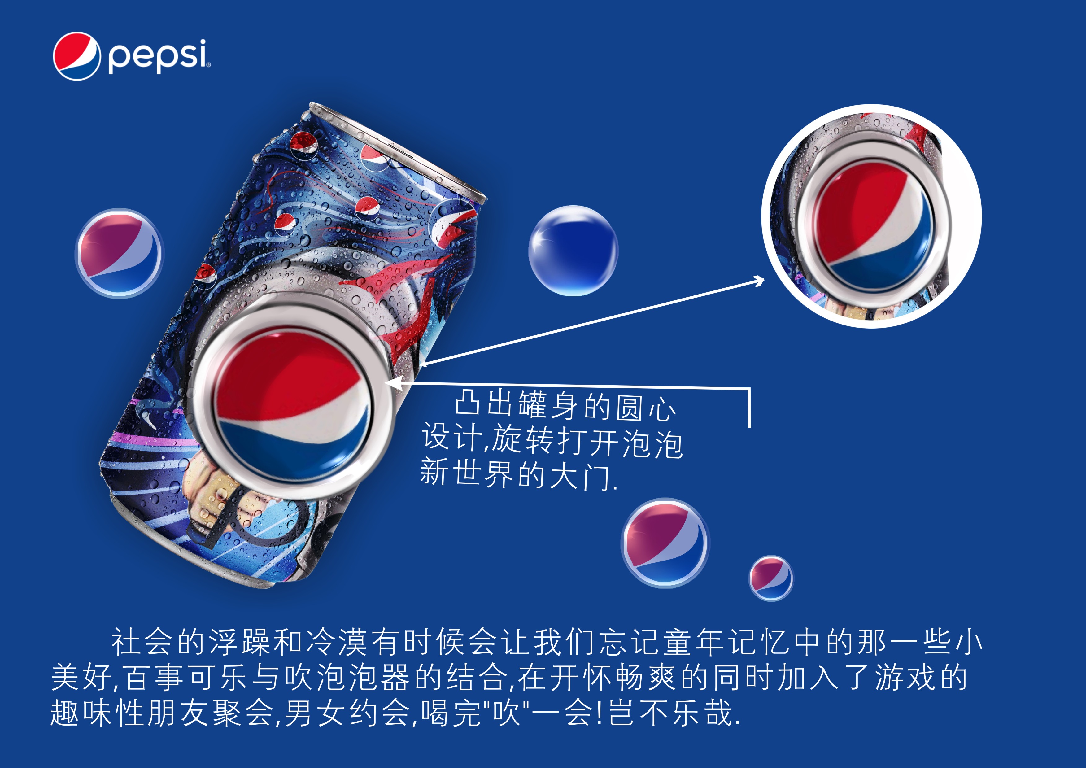 百事泡泡瓶 916 2812 1 设计 分享 男生女生罐展示,让大家很直观的看到瓶身与众不同的装饰绘画风格,来!一起开启百事新次元。 罐顶增加一个类似牛奶盒一样的密封孔,作用是为了在喝完可乐以后拿出随赠的吸管插入,同时打开罐身的凸出部分盖子,深吸一口气吹起吸管,接下来就是享受泡泡快乐的时间了。 罐身使用带内胆的双层结构饮料瓶,可以有效的将可乐和泡泡水隔离开,可乐在内,泡泡在外。 赞一下 百事百战 ‹ › 发布