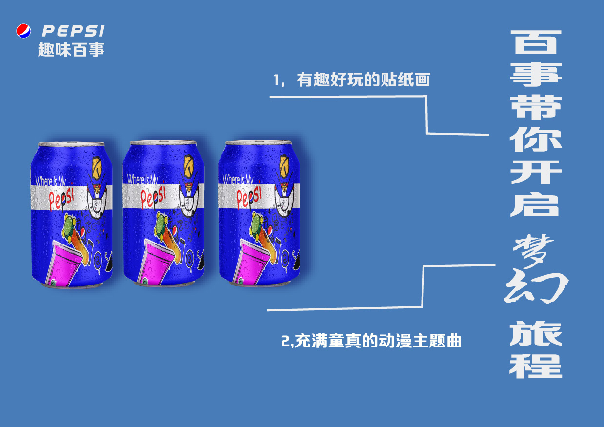 ”趣味百事“我们的主题;这是第一张,说明百事的功能,首先第一个功能是可以在百事瓶子上斯下好看的贴画拼成一个场景,第二个功能是带有“百事mp3"的感应器,通过这个感应器可以听各种各样的动漫主题曲