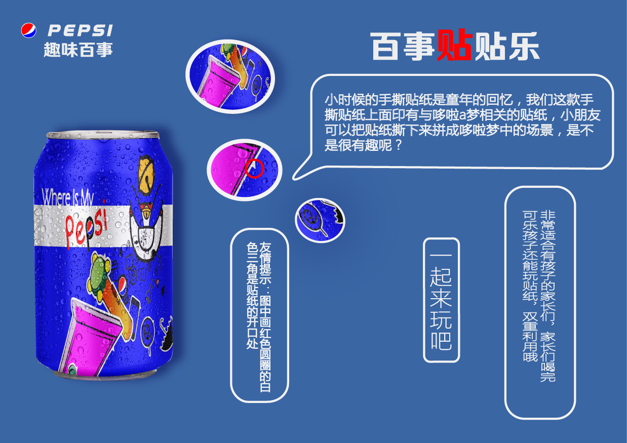 ”趣味百事“第一个功能:还记得哆啦a梦的竹蜻蜓、铜锣烧、任意门吗?有了我们这个”趣味百事“我们现在就可以用手撕下包装罐上的贴纸拼成哆啦a梦中的场景,也可以撕下来粘到任何地方,小朋友是不是很期待呢?还有就是,当家长喝完可乐的时候空罐子可以拿来让孩子玩玩贴纸,双向利用