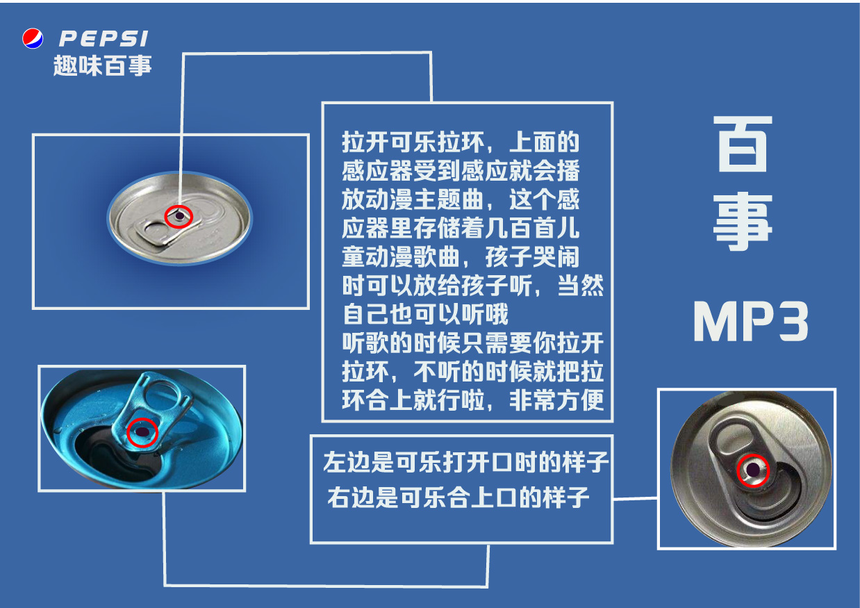 ”趣味百事“第二个功能:”百事mp3"当我们领着孩子在地铁上,孩子哭闹时就打开一瓶“趣味百动漫事”随即就会有动漫歌曲传出,吸引孩子注意力;图中红色圆圈标注的就是“百事MP3”感应器,当你拉开可乐拉环,就会播放动漫歌曲,当你不想听歌时就把拉环合上口就行,非常简单方便;这个“百事mp3感应器"中有几百首动漫歌曲,当然你自己也可以听哦