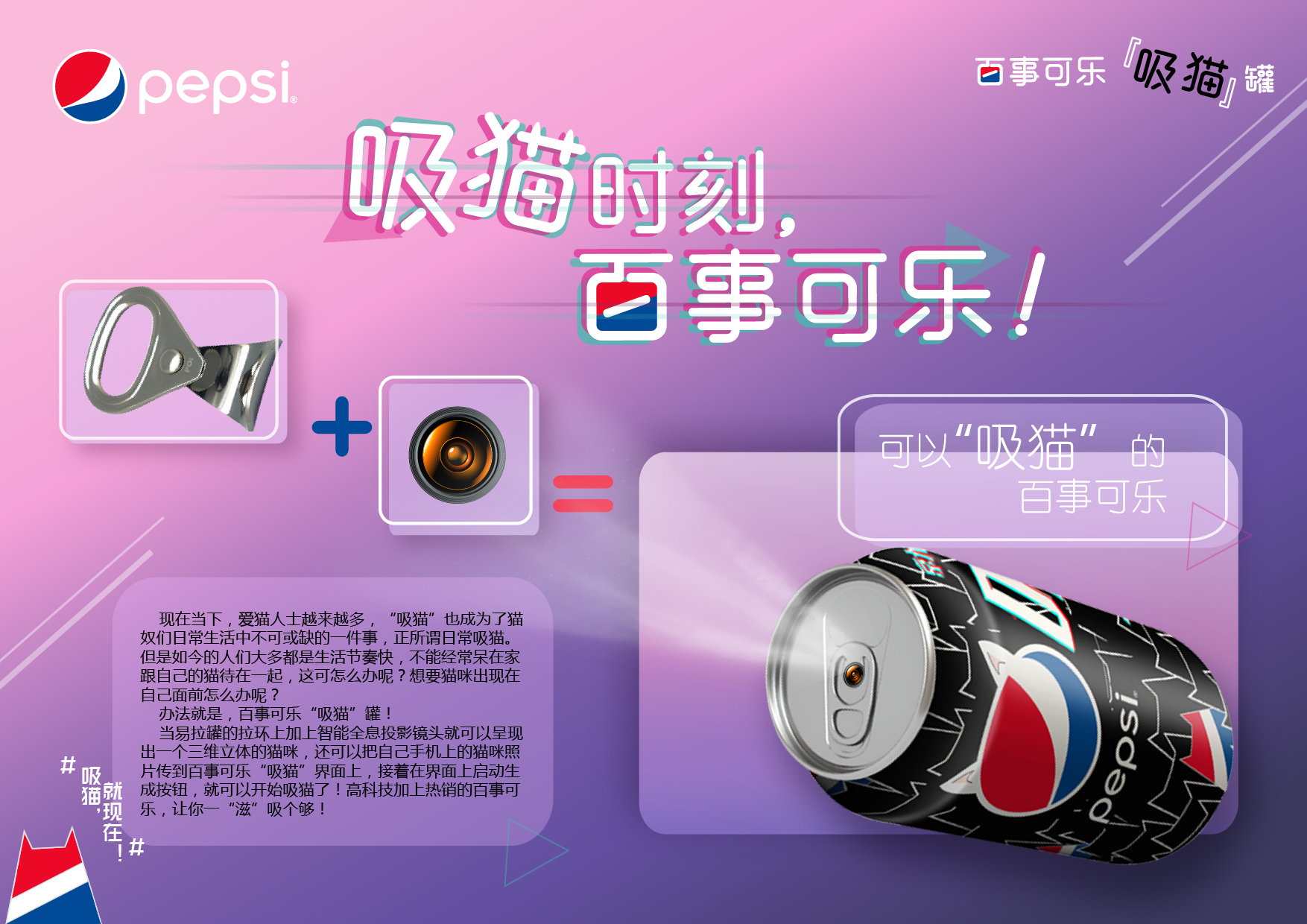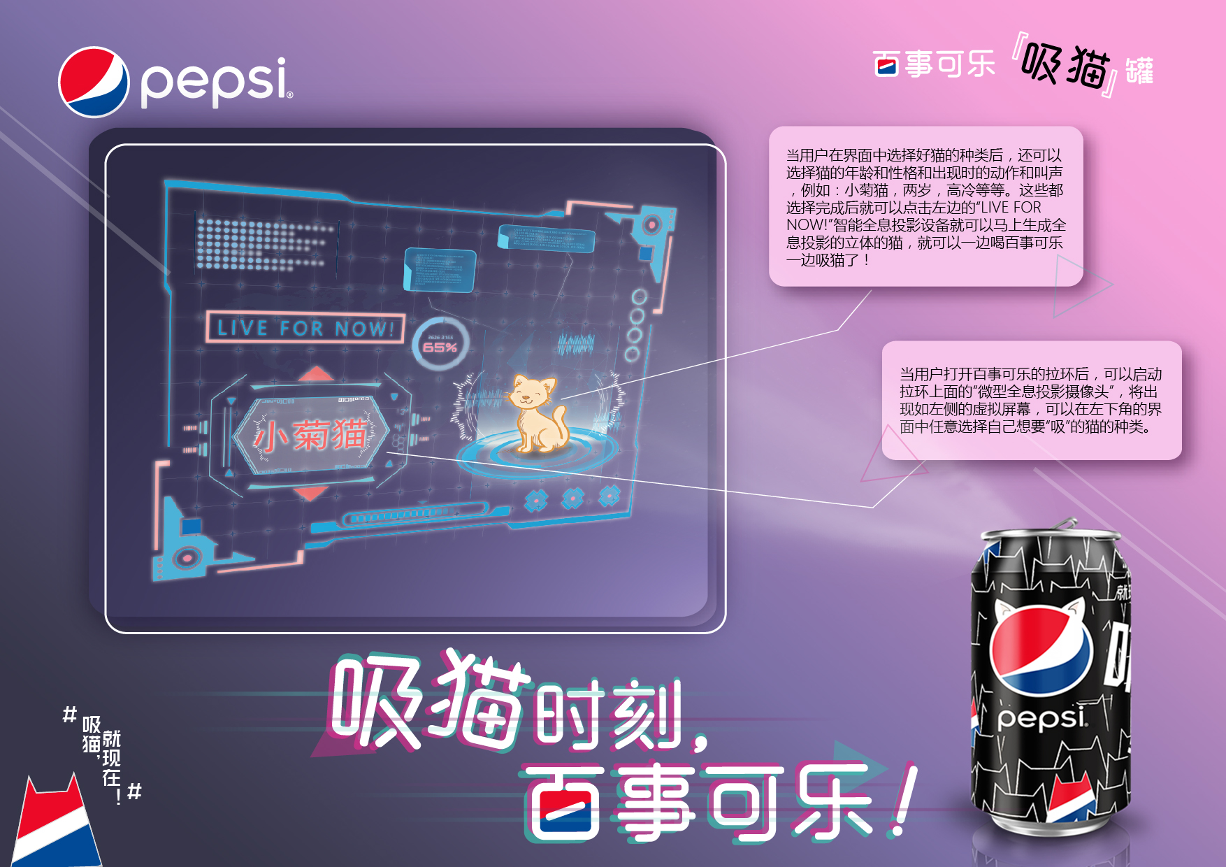 现在当下,爱猫人士越来越多,“吸猫”也成为了猫奴们日常生活中不可或缺的一件事,正所谓日常吸猫。但是如今的人们大多都是生活节奏快,不能经常呆在家跟自己的猫待在一起,这可怎么办呢?想要猫咪出现在自己面前怎么办呢? 办法就是,百事可乐“吸猫”罐! 当易拉罐的拉环上加上智能全息投影镜头就可以呈现出一个三维立体的猫咪,还可以把自己手机上的猫咪照片传到百事可乐“吸猫”界面上,接着在界面上启动生成按钮,就可以开始吸猫了!高科技加上热销的百事可乐,让你一“滋”吸个够!