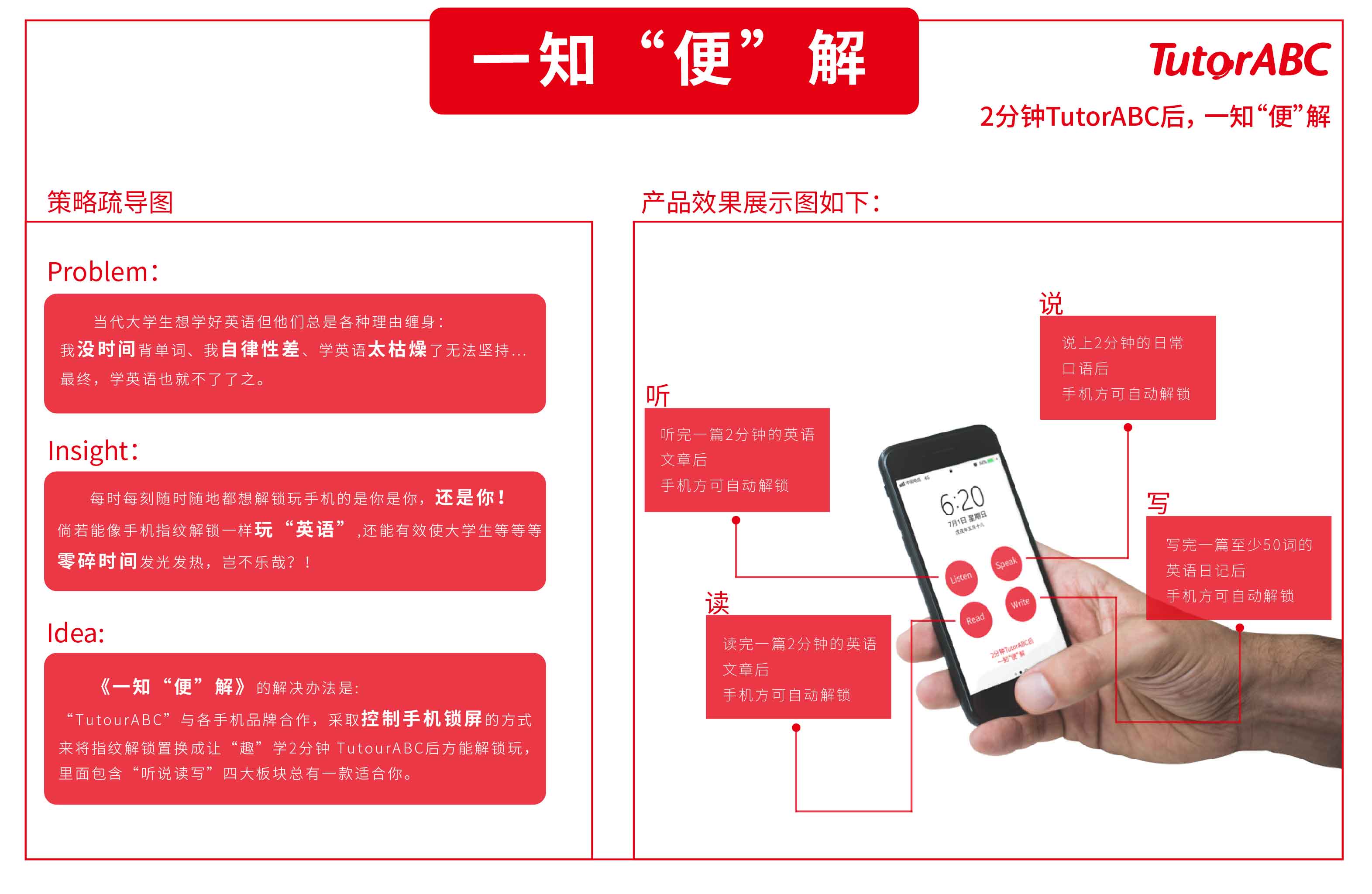 《一知“便”解》 1029 3288 0 设计 原创 分享 创意源于身边大学生的普遍现象:他们总会有各种理由为自己的学习英语找借口。而这种借口的根源是什么呢?是手机!每时每刻都在玩手机,所有的时间都花费在了玩手机上。当英语学习已经无法可以用意志来挽回的时候,由此诞生TutorABC《一知“便”解》。将其控制手机锁屏,里面含有“听、说、读、写”四大板块。只要你一想玩手机就不得不先学习2分钟。让碎片化时间的英语学习成为一种高效且有趣的学习方式,TutorABC可以做到。 赞一下 Big person 重庆市 关注 查看更多信息 ‹ › 发布