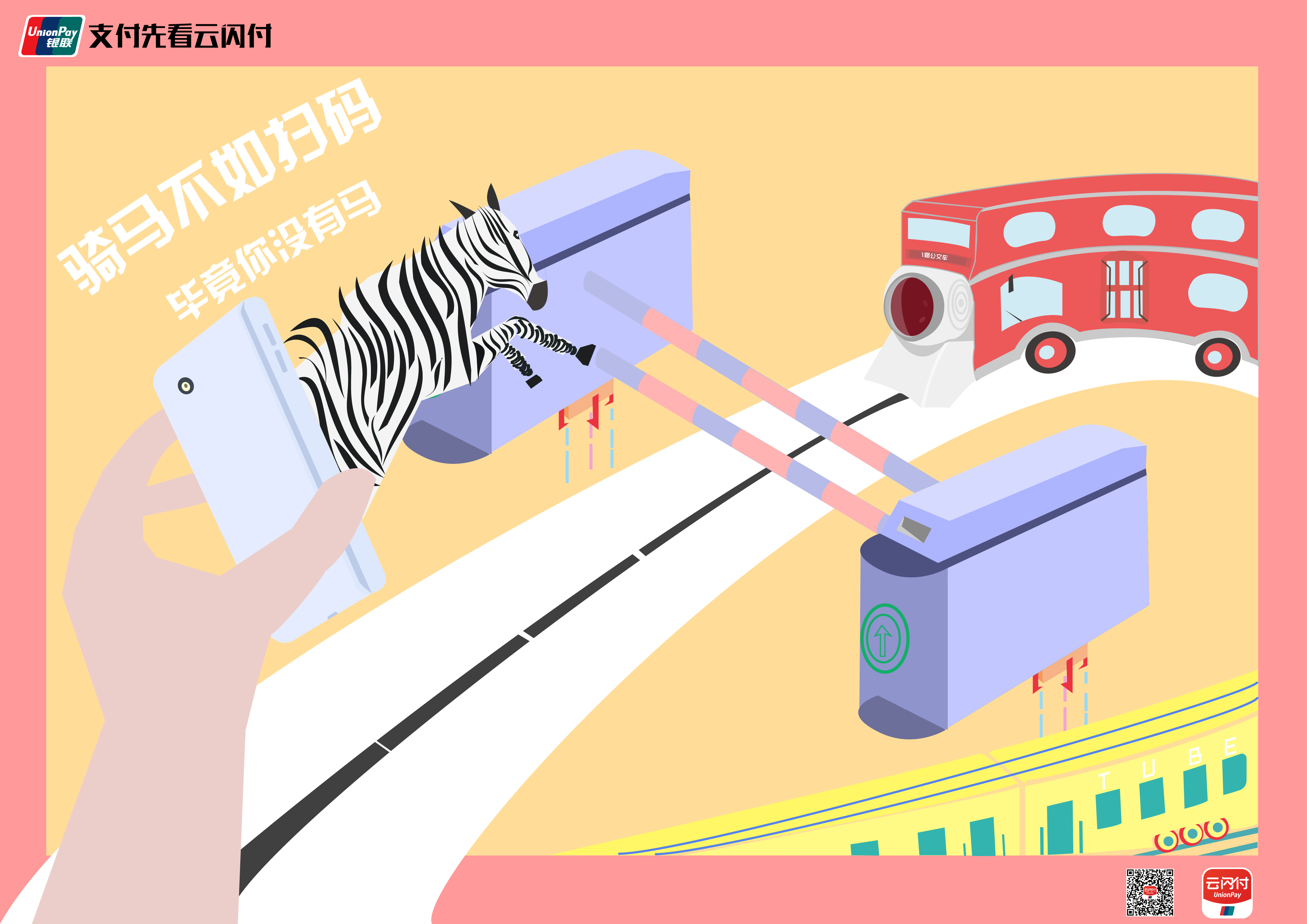 以公交、地铁的移动支付场景为出发点展开丰富联想。视斑马为二维码,融扫码机、双层巴士、地铁为一体,在双方的即将碰撞中展现云闪付强大的快捷支付功能。