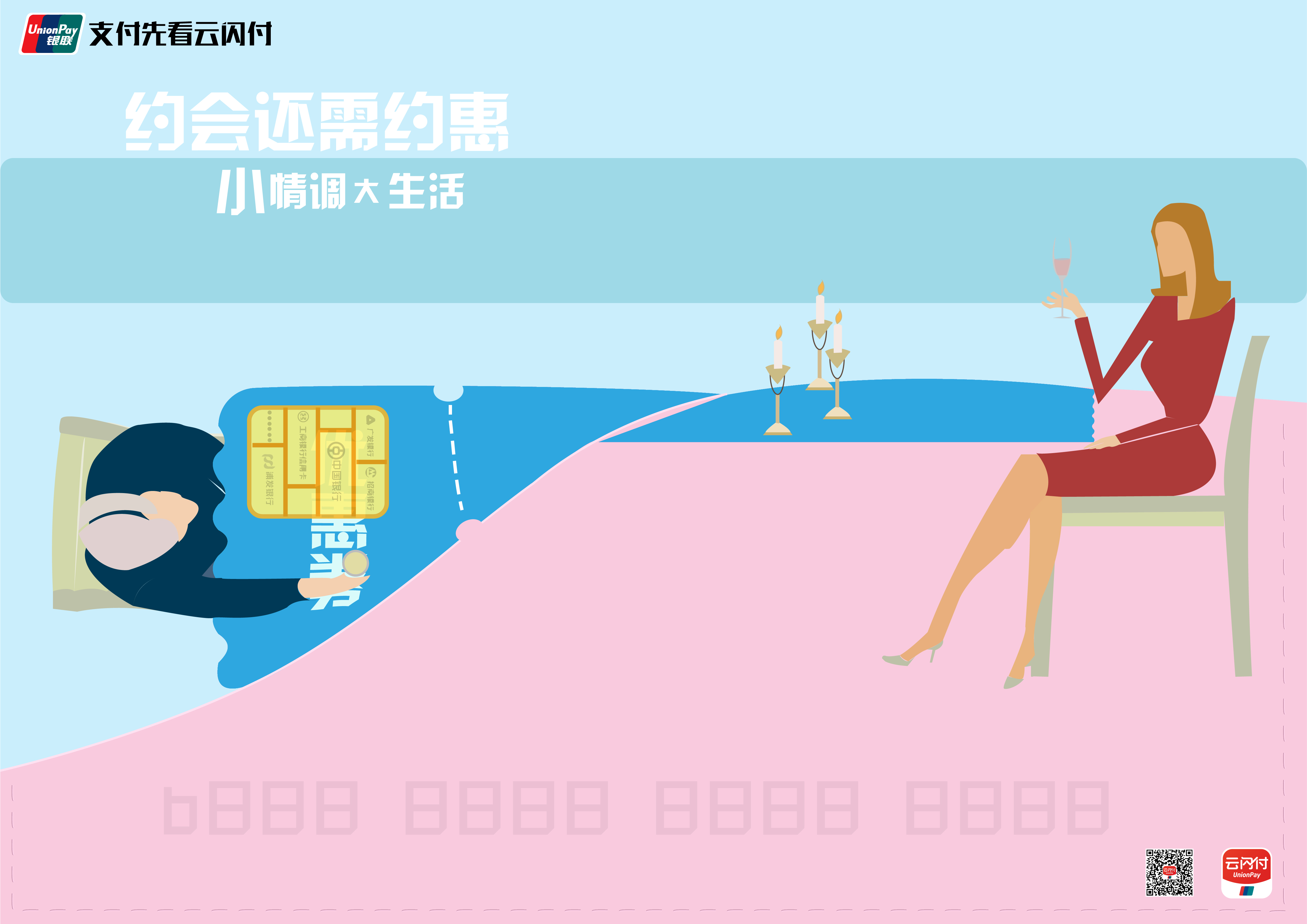 本次云闪付的目标受众是年轻群体,而约会与约“惠”是年轻人的重要需求。该图以放在粉色卡袋的银行卡和优惠券为主题进行场景建构,刻画了通过优惠享受着美好约会时光的情侣生活。