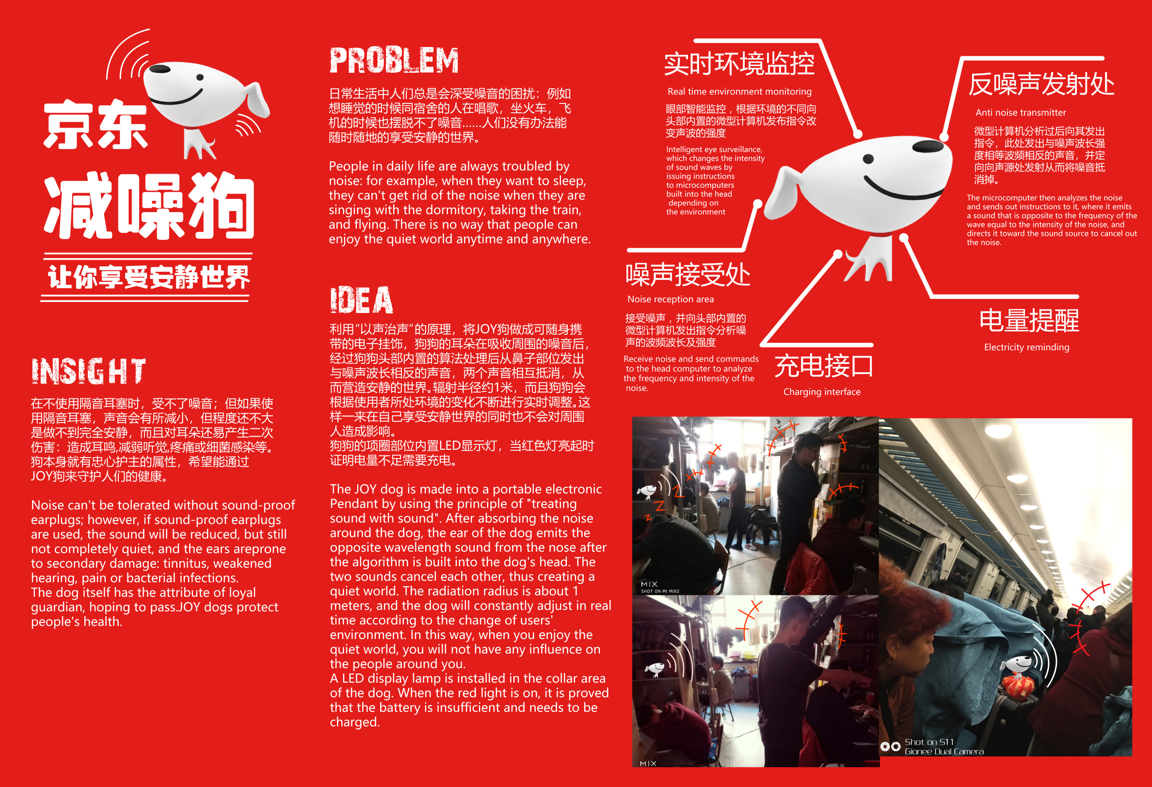 阐述想法,洞察并简要描述减噪狗的各个部分及功能,以及展示实际应用场景。