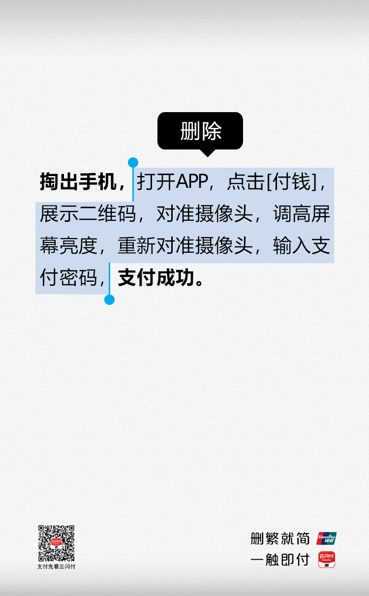 【删繁就简,一触即付-支付宝篇】 本KV突出了银联云闪付“无需扫码,轻触POS机即可支付”的优势。图中模拟手机文本,选中支付宝付款所需的繁琐步骤,并弹出删除选项,比喻使用银联云闪付,就能删除这些繁琐步骤,只需“掏出手机”,便可直接“支付成功。”选择游标的颜色来自支付宝logo,隐喻了支付宝支付步骤的繁琐不便。