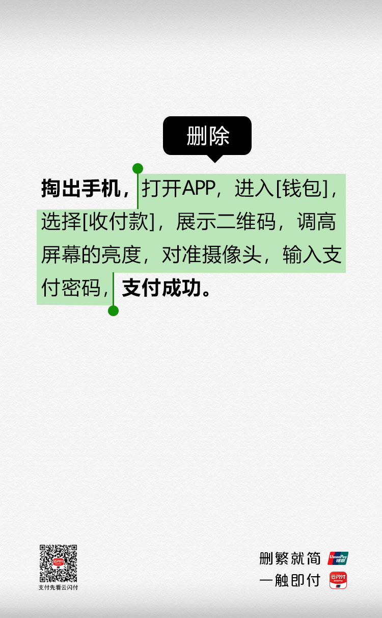 【删繁就简,一触即付-微信篇】 本KV突出了银联云闪付“无需扫码,轻触POS机即可支付”的优势。图中模拟手机文本,选中微信付款所需的繁琐步骤,并弹出删除选项,比喻使用银联云闪付,就能删除这些繁琐步骤,只需“掏出手机”,便可直接“支付成功。”选择游标的颜色来自微信logo,隐喻了微信支付步骤的繁琐不便。
