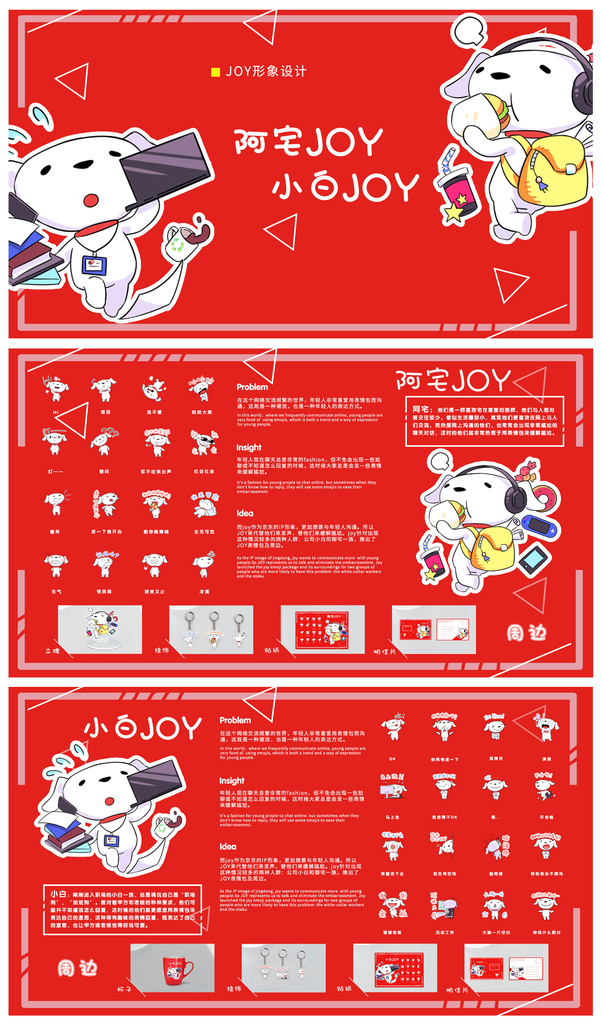 Problem:在这个网络交流频繁的世界,年轻人非常喜爱用表情包而沟通,这既是一种潮流,也是一种年轻人的表达方式。 Insight:年轻人现在聊天总是非常的fashion,但不免会出现一些尬聊或不知道怎么回复的时候,这时候大家总是会发一些表情来缓解尴尬。 Idea:而Joy作为京东的IP形象,更加想要与年轻人沟通。所以JOY来代替他们来发声,替他们来缓解尴尬。Joy针对出现这种情况较多的两种人群:公司小白和御宅一族,推出了JOY表情包及周边。 御宅:他们是一群喜欢宅在家里的族群,他们与人面对面交往较少、看似生活圈狭小,其实他们更喜欢在网上与人们交流,而热爱网上沟通的他们,也常常会出现非常尴尬的聊天对话,这时的他们就非常热衷于用表情包来缓解尴尬。 小白:刚刚进入职场的小白一族,总是调侃自己是“职场狗”,“加班狗”。面对着甲方和老板的种种要求,他们可能并不知道该怎么回复,这时候的他们就更愿意用表情包来表达自己的意思,这种带有趣味的表情回复,既表达了自己的意思,也让甲方或老板觉得好玩可爱。