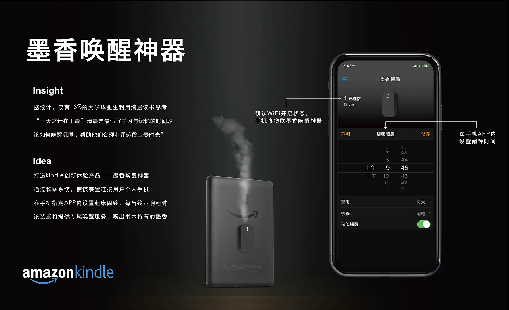 墨香唤醒神器 287 2894 0 kindle产品创新 分享 Insight 据统计,仅有13%的大学毕业生利用清晨读书思考 “一天之计在于晨”清晨是最适宜学习与记忆的时间段 该如何唤醒沉睡,帮助他们合理利用这段宝贵时光? Idea 打造kindle创新体验产品——墨香唤醒神器 通过物联系统,使该装置连接用户个人手机 在手机指定APP内设置起床闹铃,每当铃声响起时 该装置将提供专属唤醒服务,喷出书本特有的墨香 赞一下 疯狂的候鸟 ‹ › 发布